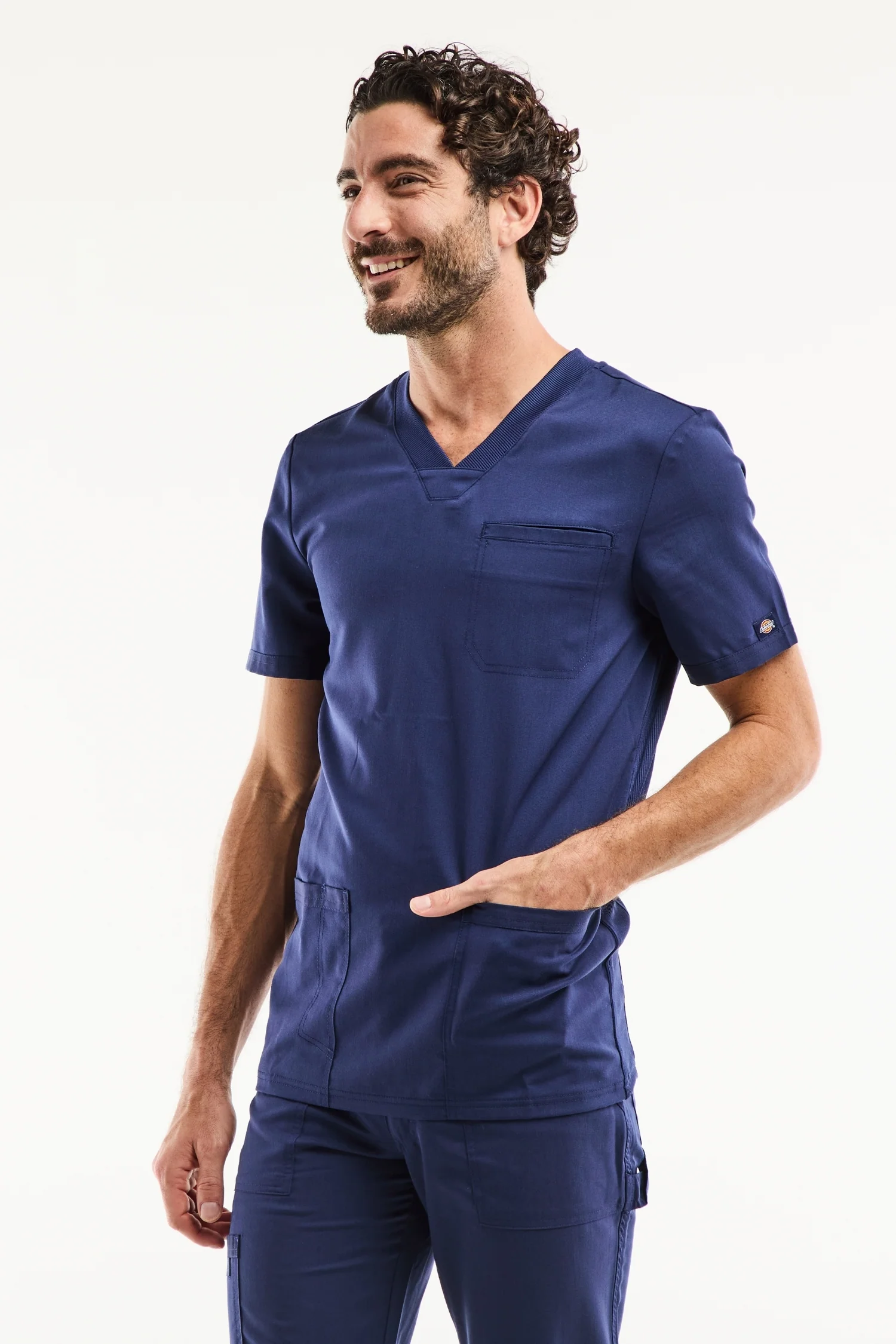 Ce haut élégant à col en V présente un col en tricot, deux poches plaquées à l’avant, des parties en tricot au dos pour le confort. Une boucle élastique a été ajoutée à l’empiècement droit pour maintenir votre badge d’identification dans la position idéale. Coupe contemporaine.