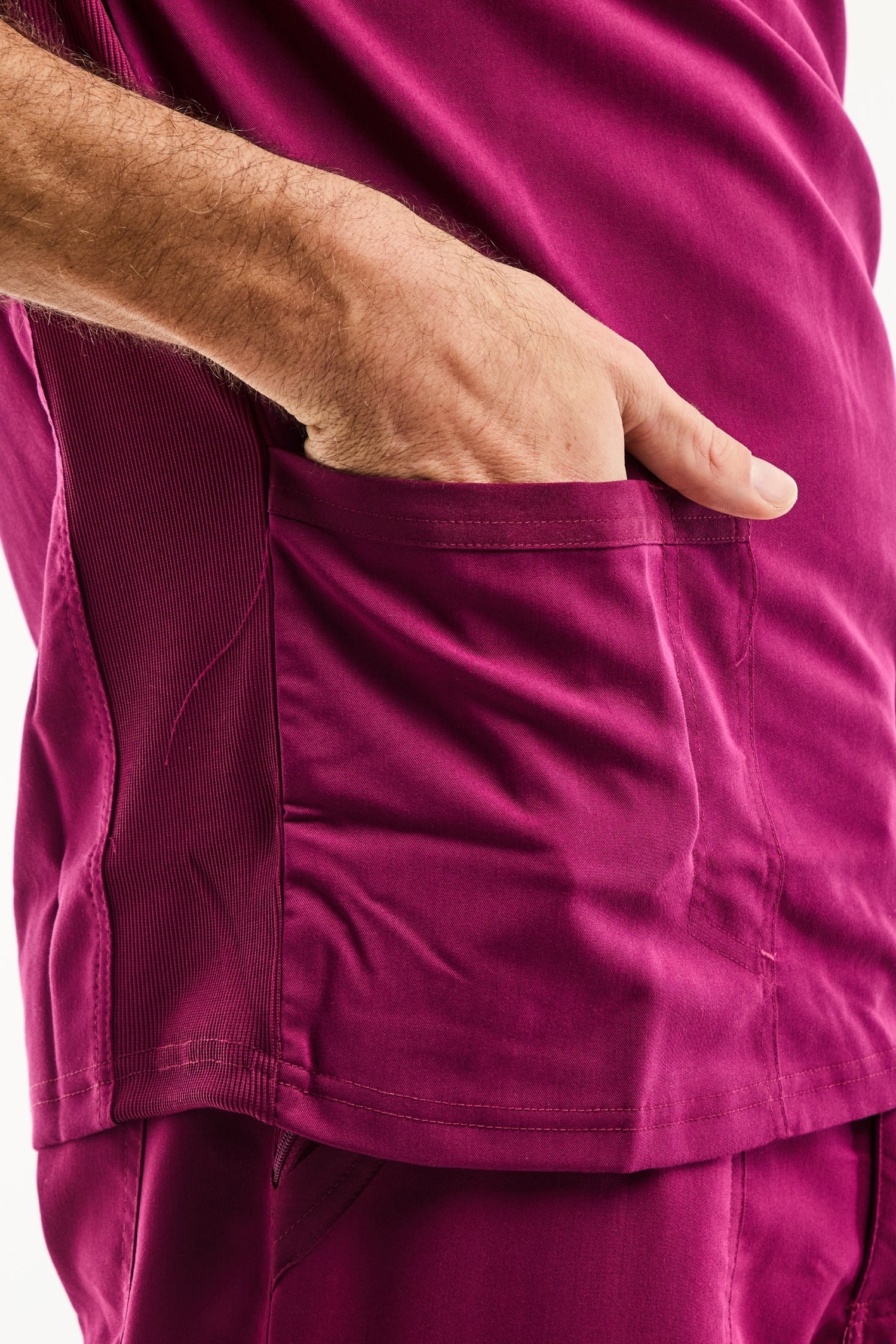 Ce haut élégant à col en V présente un col en tricot, deux poches plaquées à l’avant, des parties en tricot au dos pour le confort. Une boucle élastique a été ajoutée à l’empiècement droit pour maintenir votre badge d’identification dans la position idéale. Coupe contemporaine.