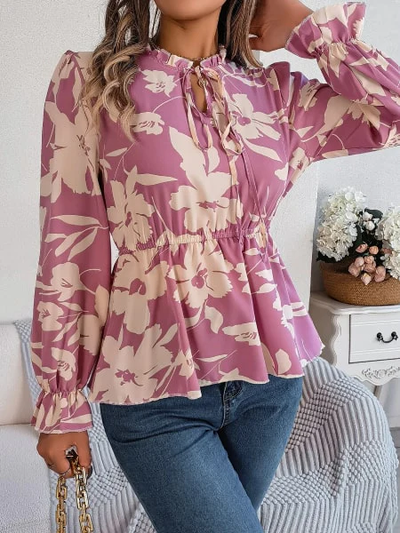 Blouse fleurie rose avec manches longues et larges