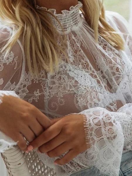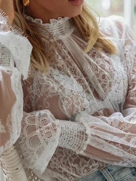 Romantique et sexy, cette blouse transparente fleurie est composée d’une matière en polyester ornée de fines broderies florales. Le col montant élastique combiné aux manches longues avec volants en bout casse le côté provocant de la transparence des tissus.
