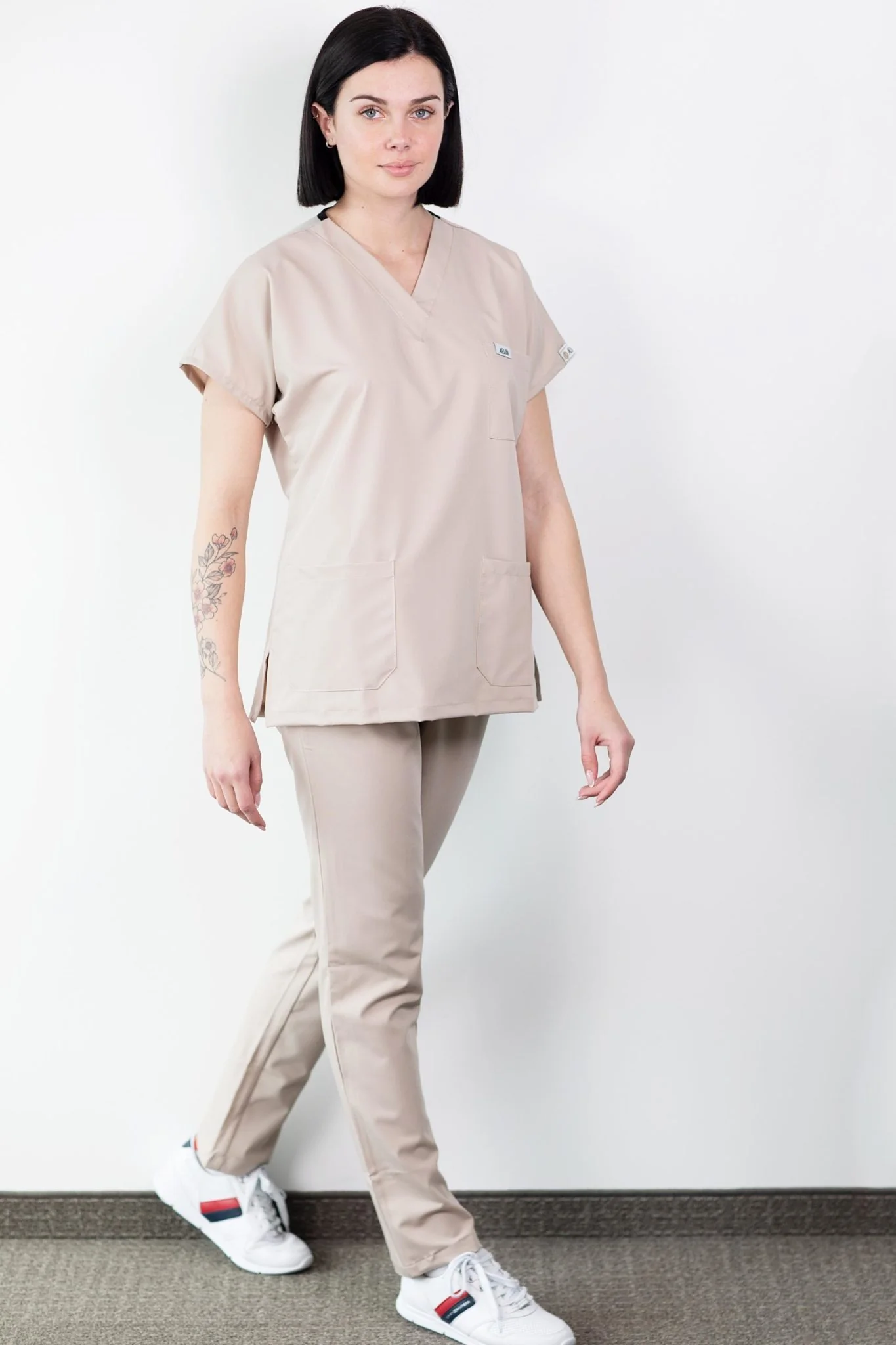 - Description : une tunique dotée de manches courtes et d’un col en V. 3 poches.