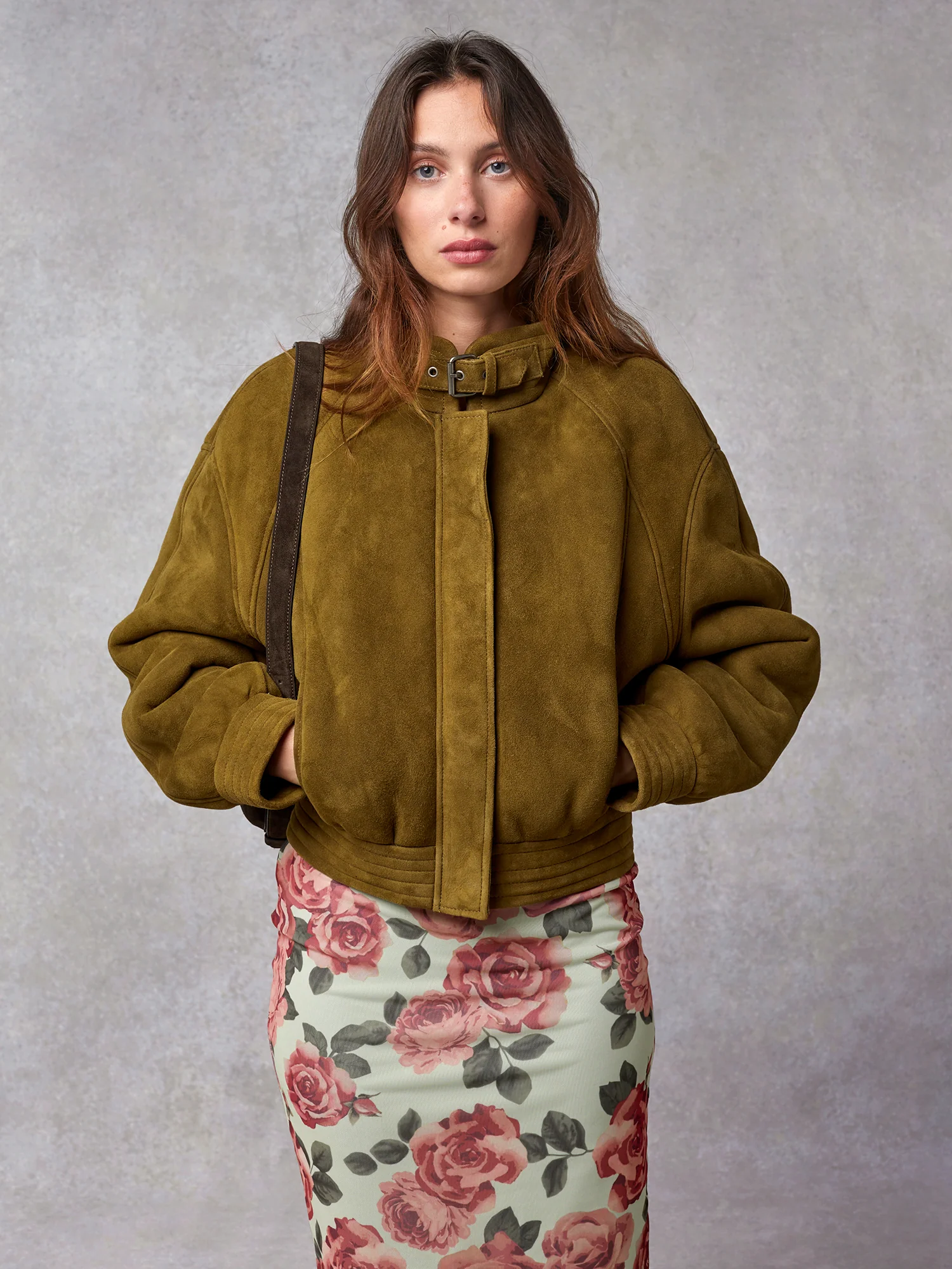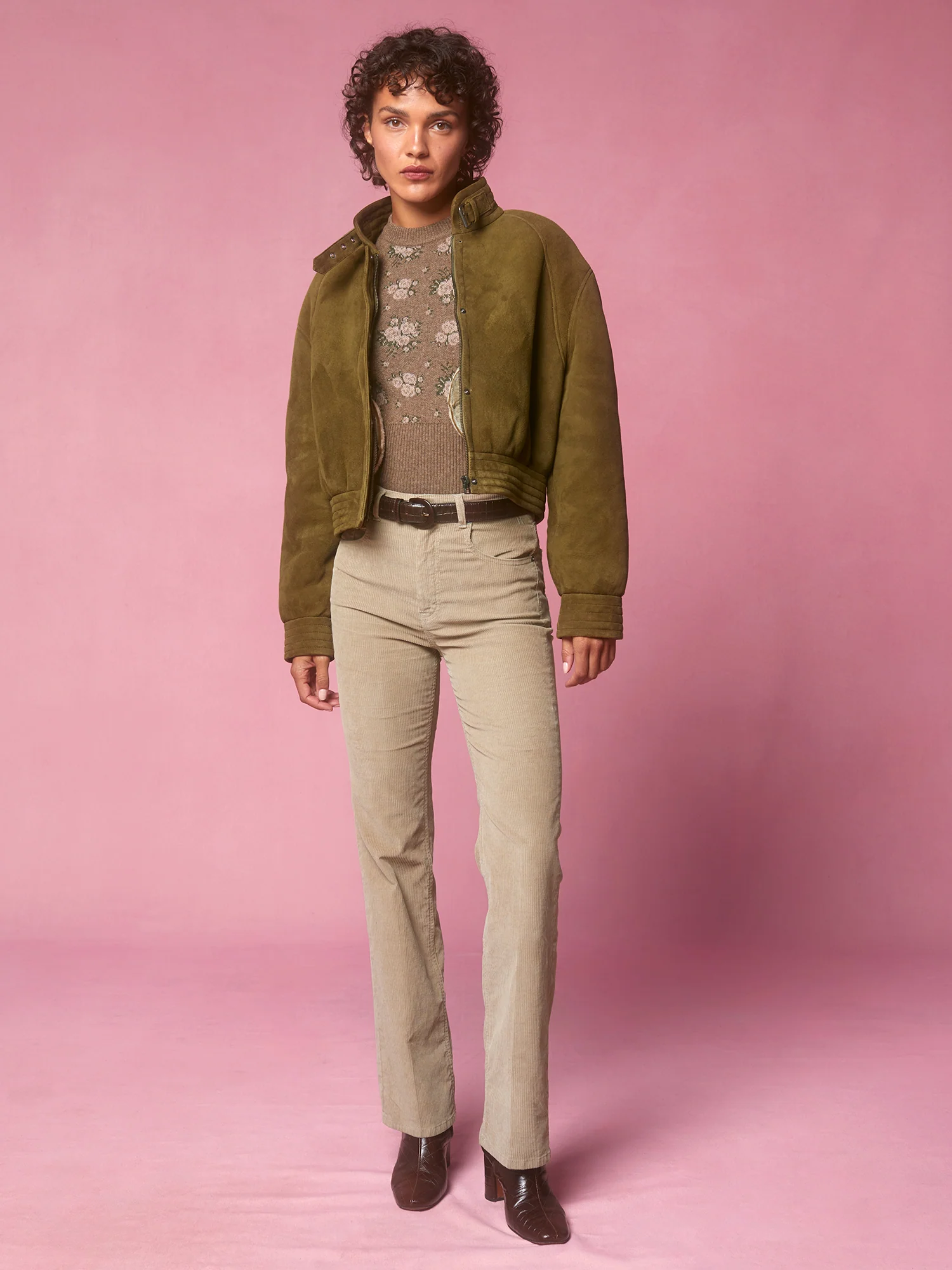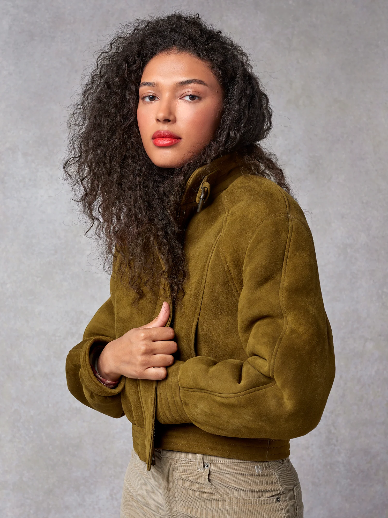 Blouson court style bomber en peau lainée.