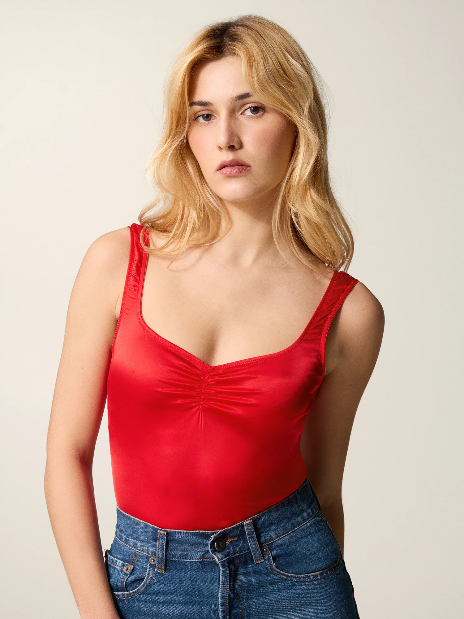 Body satiné à encolure coeur carrée.