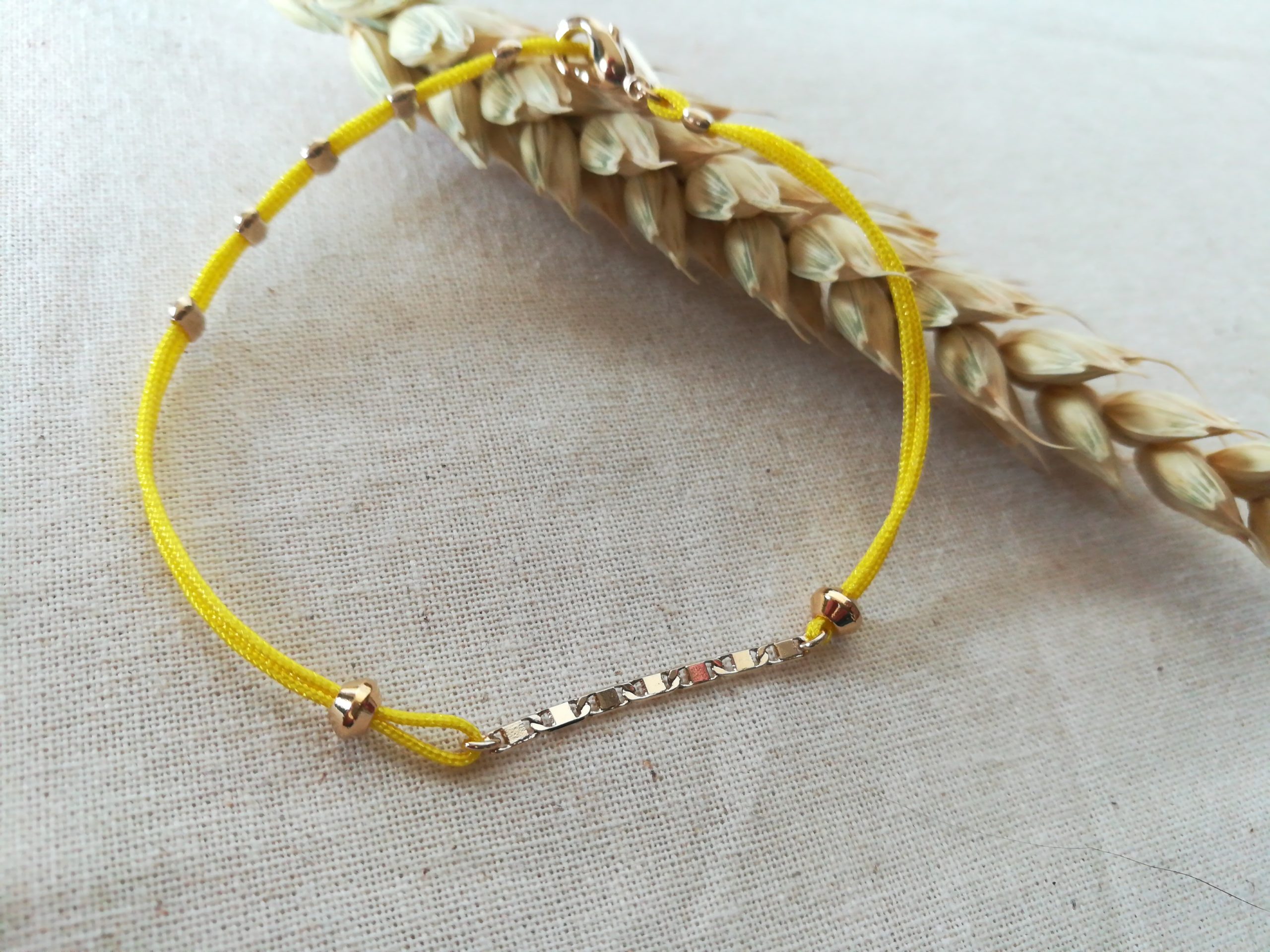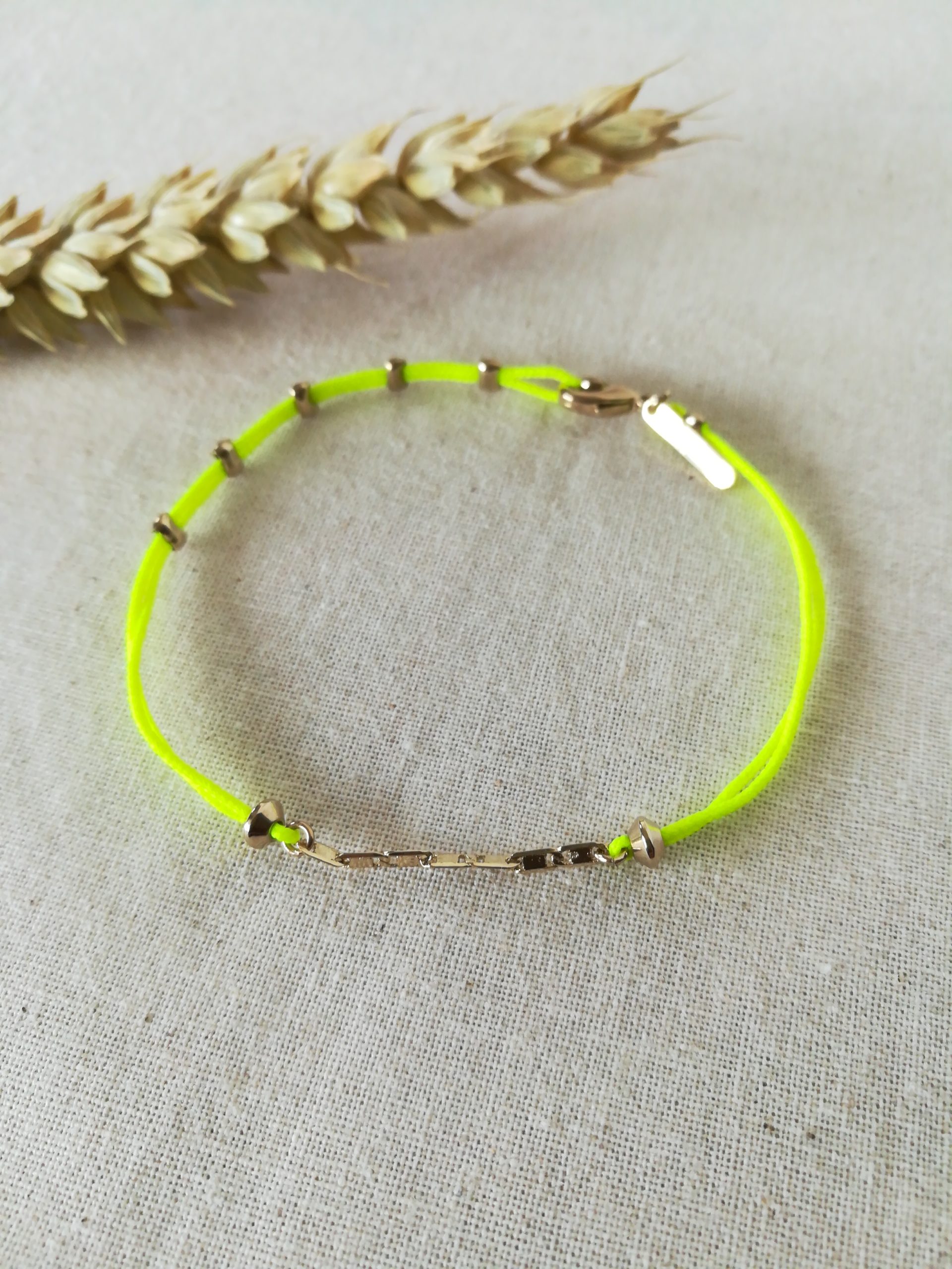 Bracelet en fil de Polyester de couleur & fine chaine plate dorée à l’or fin de couleur Champagne.