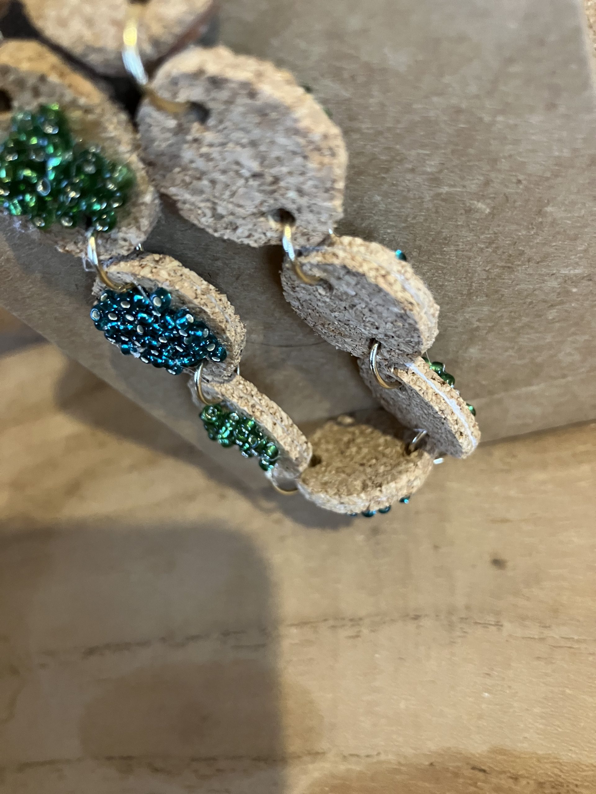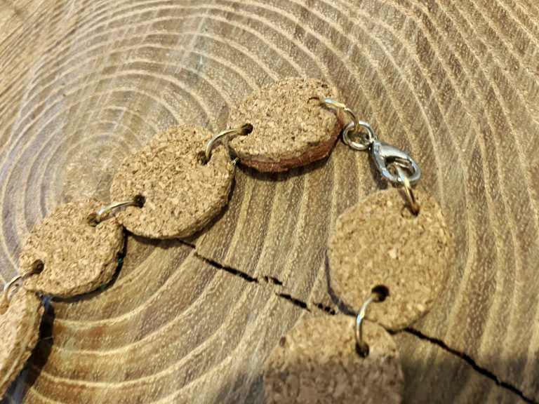 Ce bracelet chic est réalisé avec du liège, de la fibre d’ananas et de perles fantaisies.