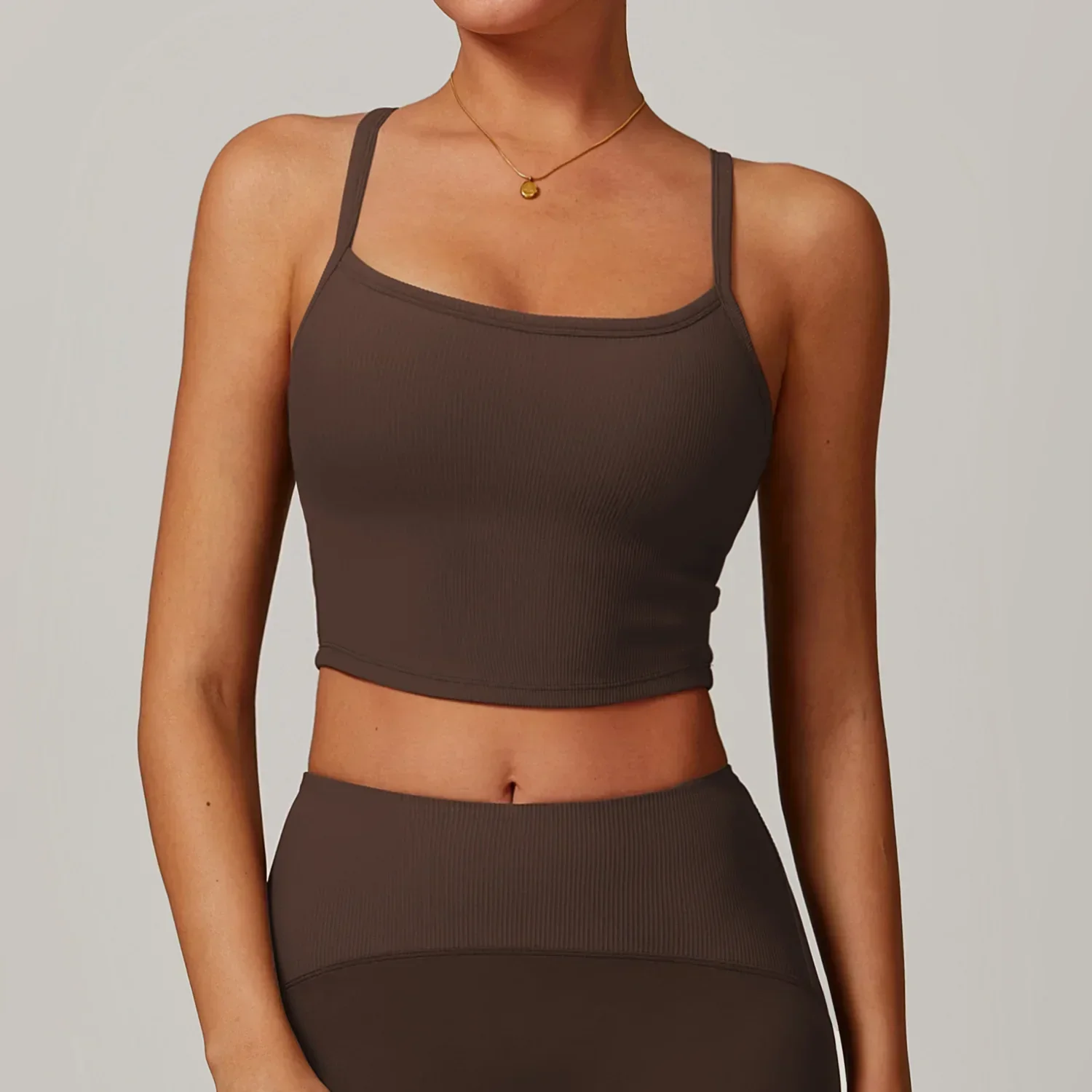 Sublimez votre tenue de yoga avec cette brassière au design raffiné, pensée pour offrir à la fois confort et style. Sa coupe légèrement allongée et son encolure droite mettent en valeur votre silhouette, tandis que son dos nageur ajoute une touche d’élégance sportive et garantit une grande liberté de mouvement. Conçue dans un tissu côtelé extensible, elle épouse parfaitement vos courbes tout en restant douce sur la peau, idéale pour les sessions de yoga, de Pilates, ou même en mode athleisure.
