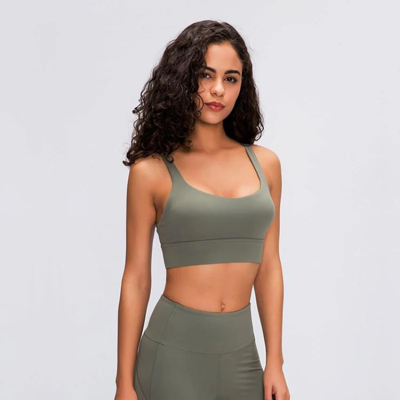 Brassière de yoga vert militaire avec bretelles fines entrecroisées dans le dos