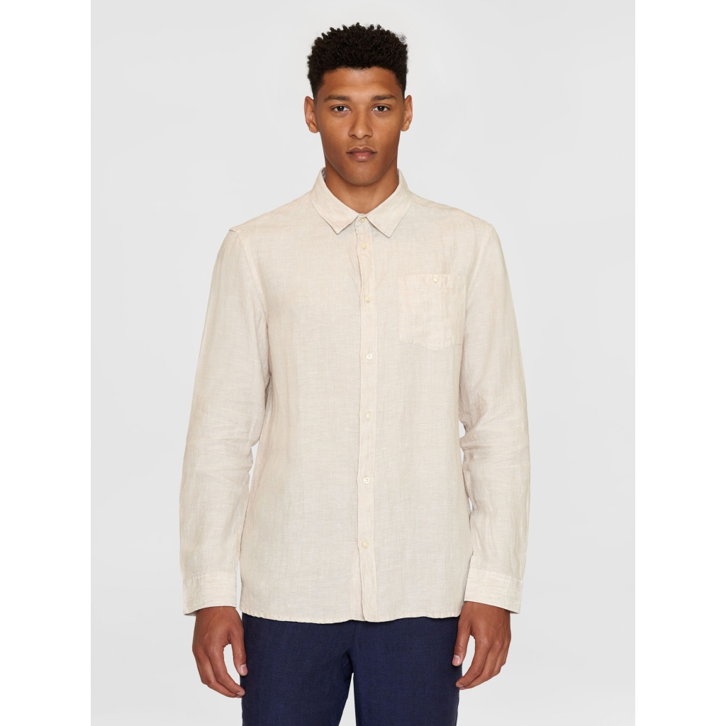 Cette chemise à manches longues est confectionnée en lin 100 % biologique. Douce au toucher, elle présente une teinture naturelle mélangée et s’intègre parfaitement à une garde-robe confortable et éco-responsable.