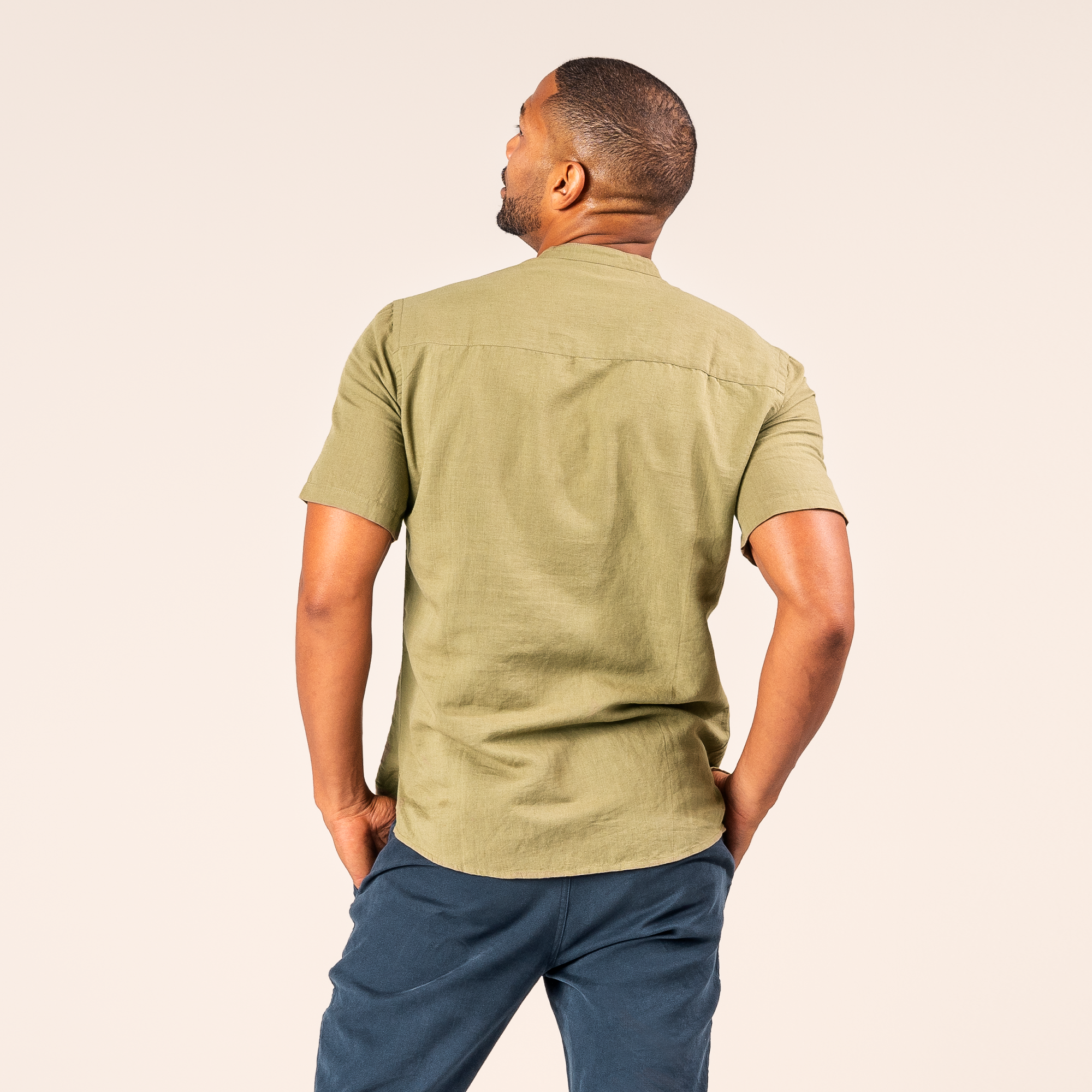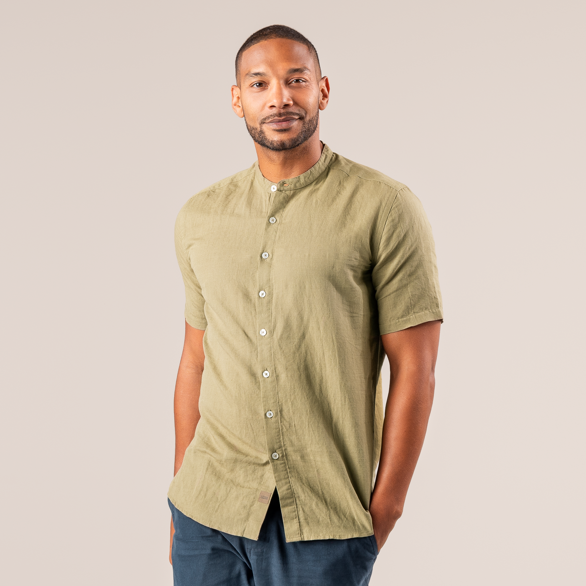 Jolie chemisette kaki légère en lin et coton bio avec un col mandarin boutonné.