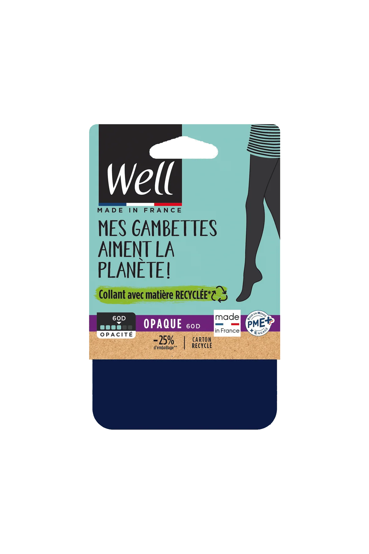 • Conçus à partir de matière recyclée, protégés par un carton recyclé et recyclable optimisé (30% de carton en moins), Well a été au bout de sa démarche en vous proposant un collant non repassé industriellement, ce qui permet de consommer 3 à 4 fois moins d’énergie lors de sa production. Le rendu sur votre jambe est identique et la planète vous remercie !