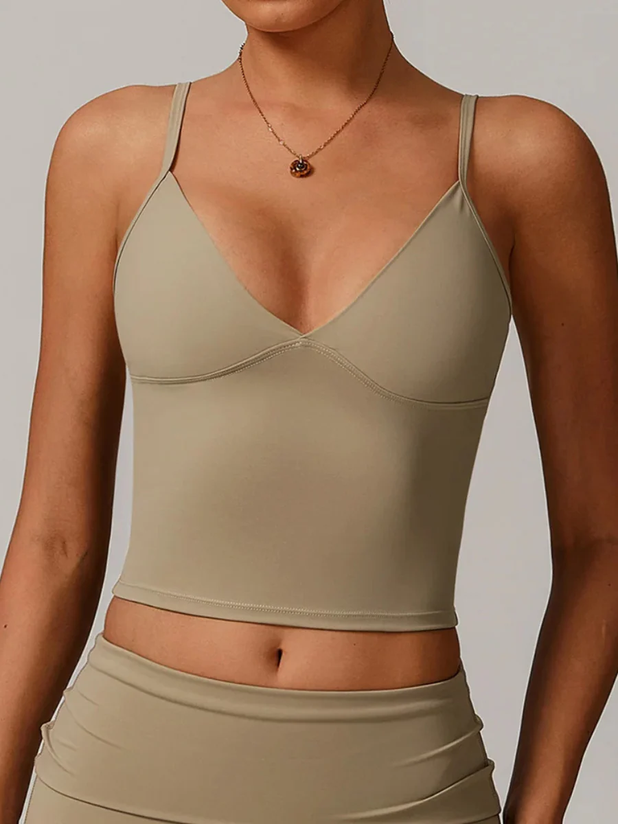 Confortable et élégant, ce débardeur à fines bretelles s’adapte à chaque mouvement grâce à sa coupe seconde peau et sa matière douce au toucher. Son encolure en V souligne délicatement le décolleté, tandis qu’une couture sous la poitrine apporte une touche structurée sans effet de compression. Les bretelles sont ajustables afin que chacune puisse trouver le maintien qui lui convient. Idéal aussi bien pour le yoga doux que pour des enchaînements plus dynamiques, ce débardeur de sport se porte tout aussi aisément en dehors du tapis. Un essentiel polyvalent pour celles qui recherchent à la fois aisance et féminité.