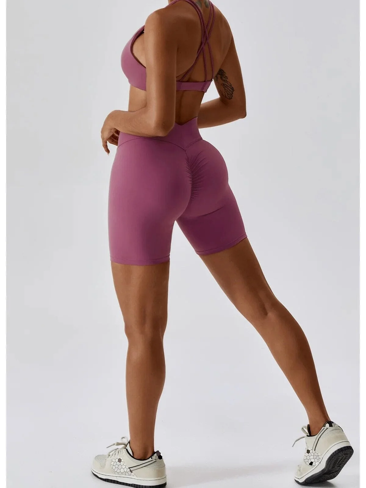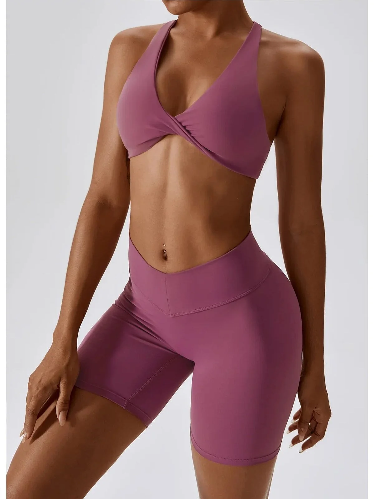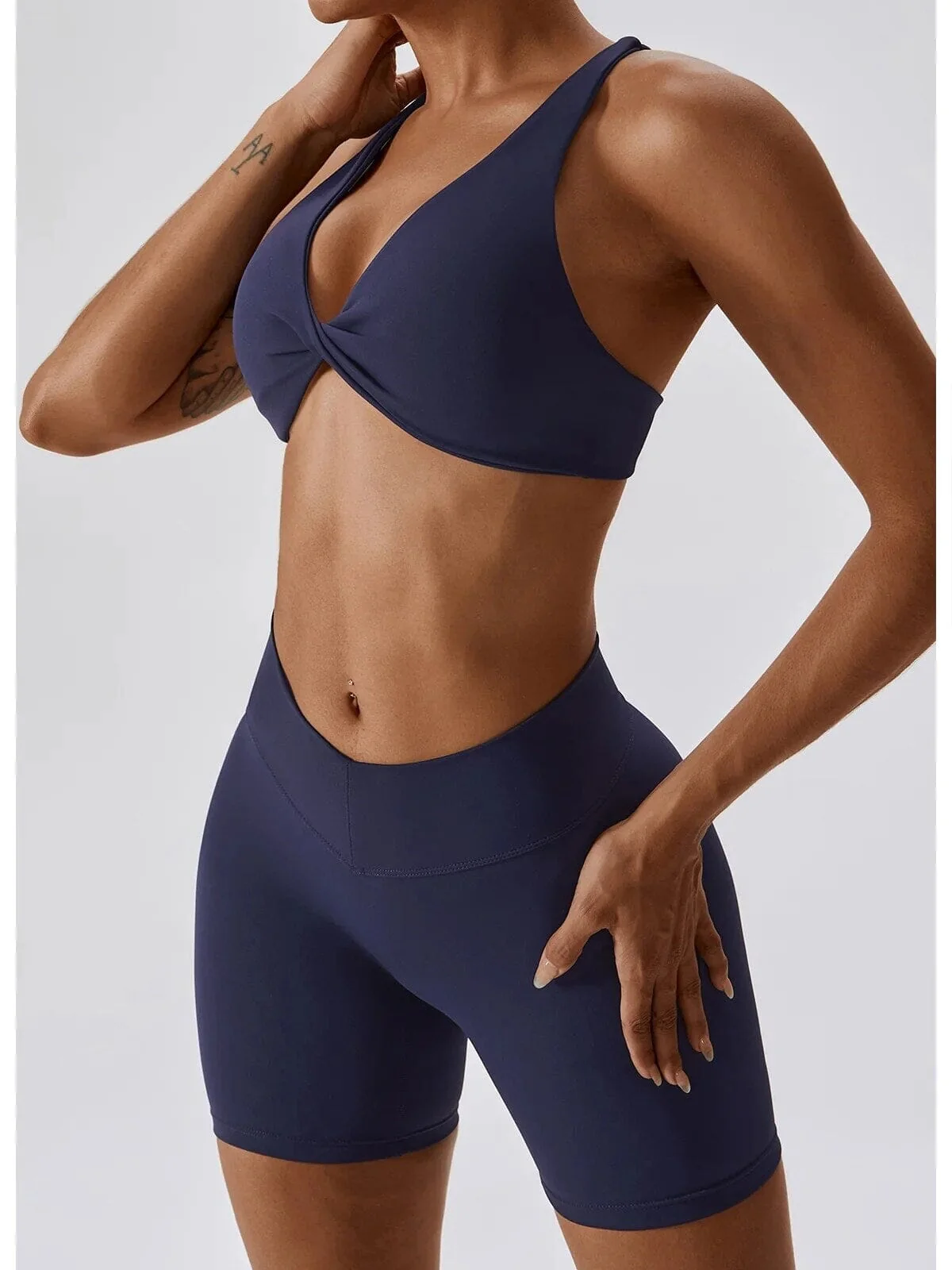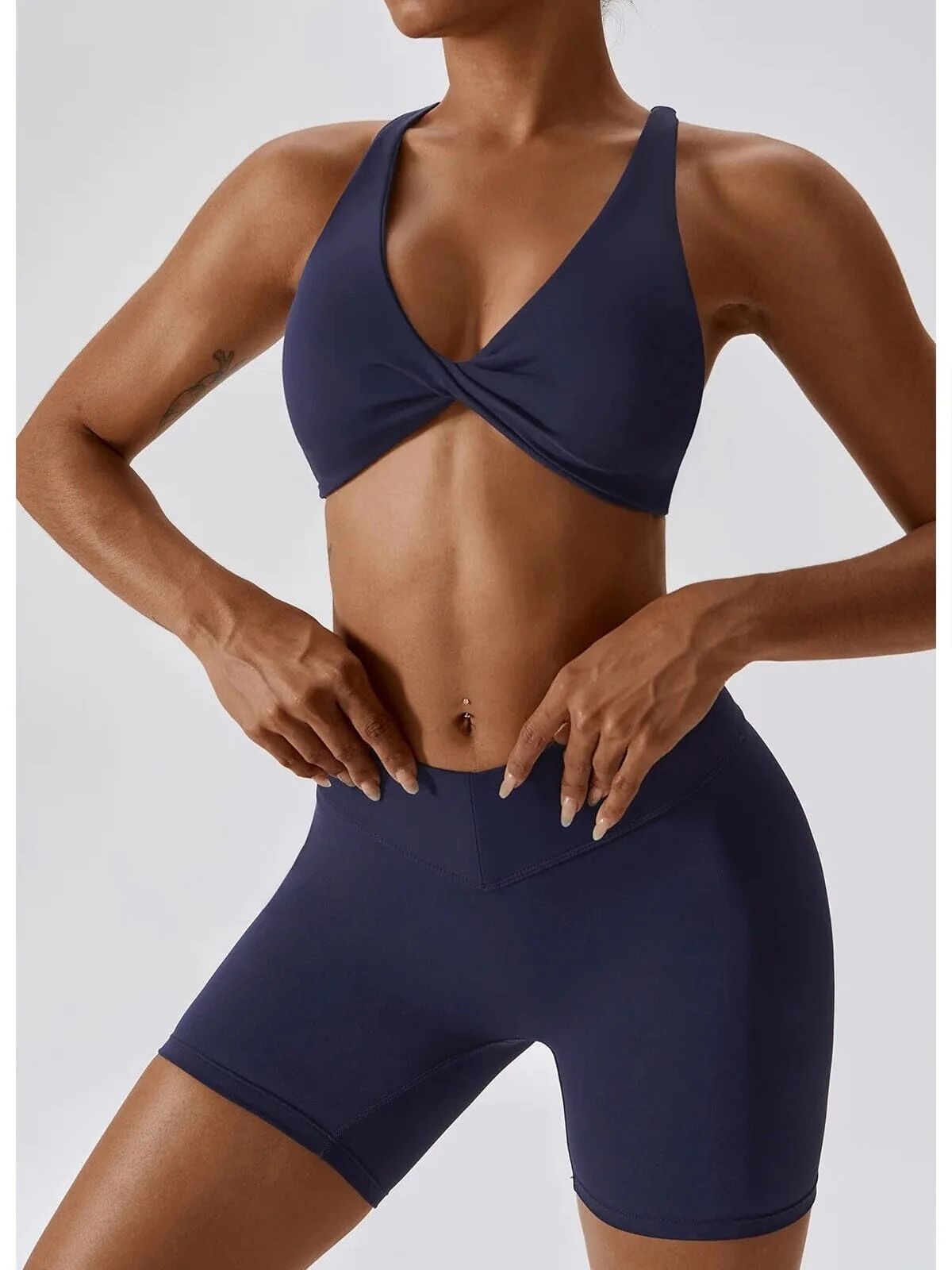 Le soutien-gorge assorti complète l’ensemble avec son soutien supérieur. Vous vous sentirez soutenue et élégante grâce à son design croisé et plissé sur le devant. Les bretelles croisées ajoutent une touche de sophistication à votre tenue sportive.