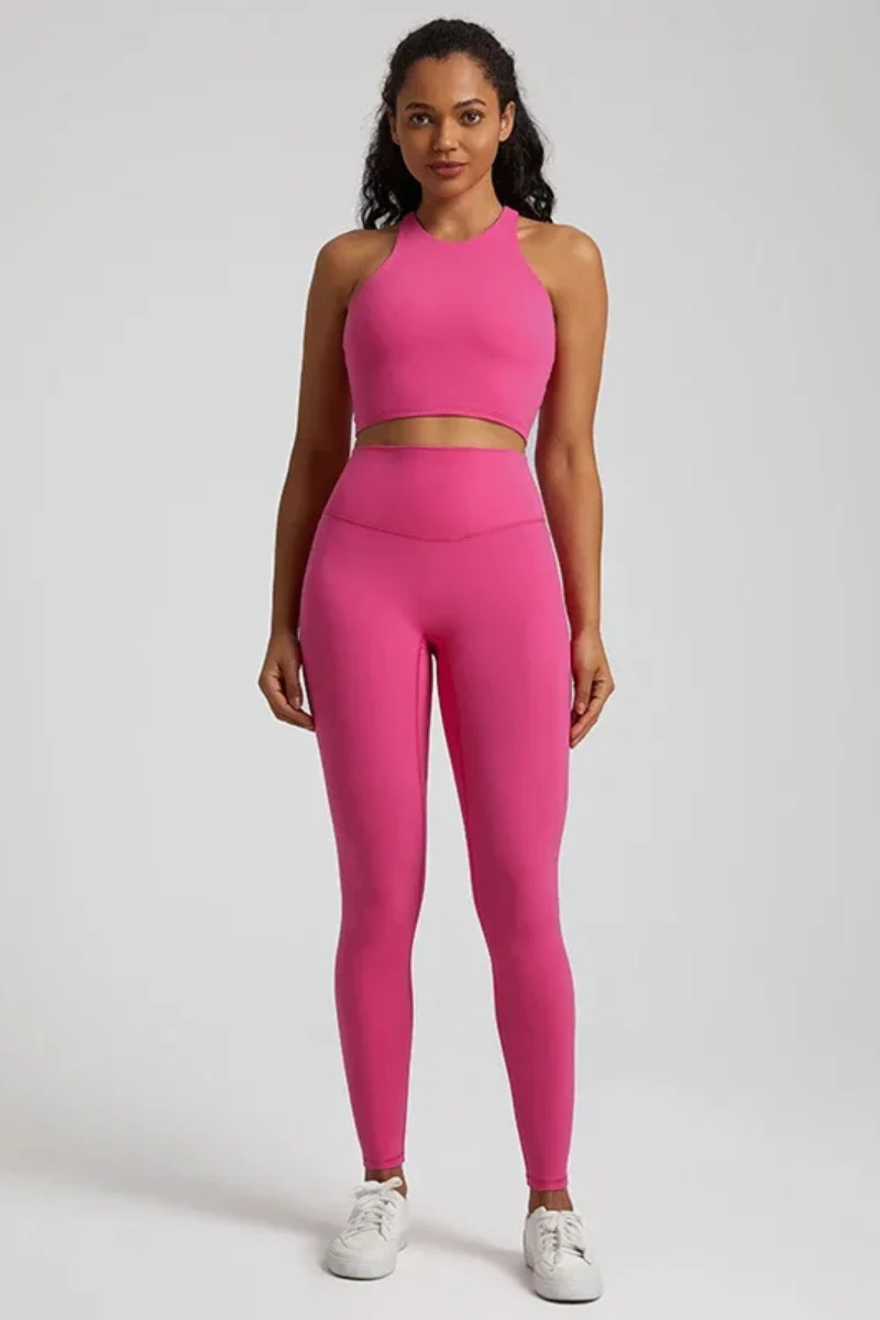 Le tissu extensible, doux et respirant vous assure une totale liberté de mouvement, que ce soit pour vos postures de yoga, votre entraînement en salle ou vos moments de détente à la maison. Le design minimaliste du haut apporte une touche élégante, tandis que la coupe du legging maintient votre ventre et allonge visuellement vos jambes.