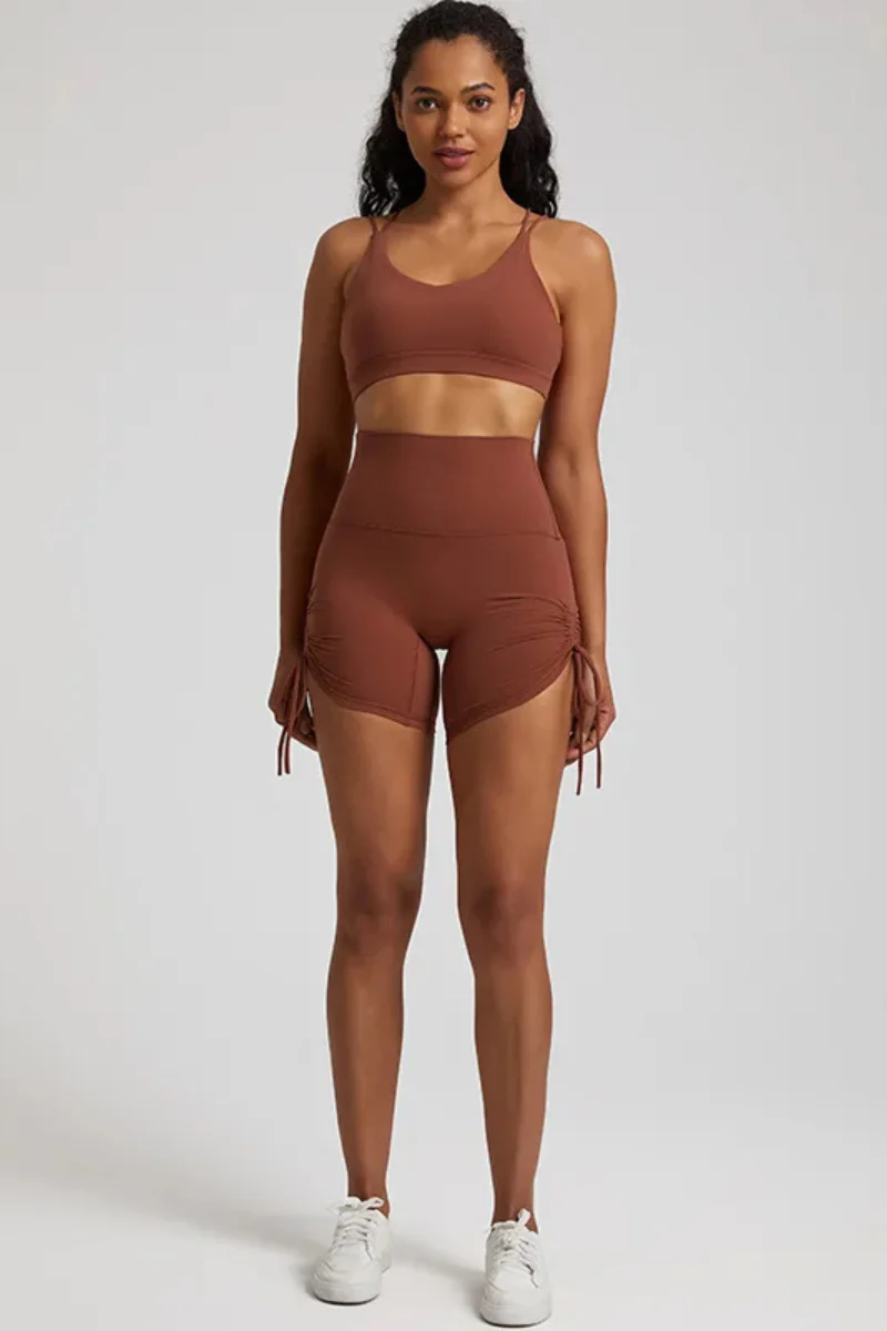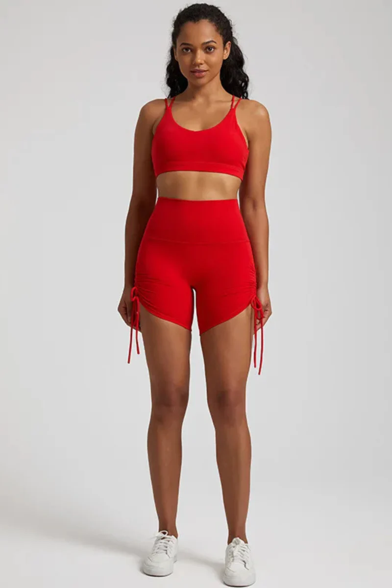 Découvrez cet ensemble de yoga au design élégant, disponible en plusieurs couleurs éclatantes. Conçu pour s’adapter à votre silhouette, cet ensemble comprend un soutien-gorge dos croisé qui offre un excellent maintien tout en étant esthétique. Le short taille haute est doté de cordons réglables sur les côtés, vous permettant de moduler la longueur selon vos envies, tout en ajoutant une touche dynamique à votre tenue.