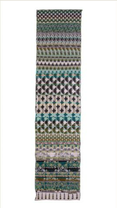 Palmiers, poissons et algues… donnent Pascal ! Un minimalisme à la Matisse, des formes simples et sobres pour une très belle étole estivale aux tons rouges chaleureux.