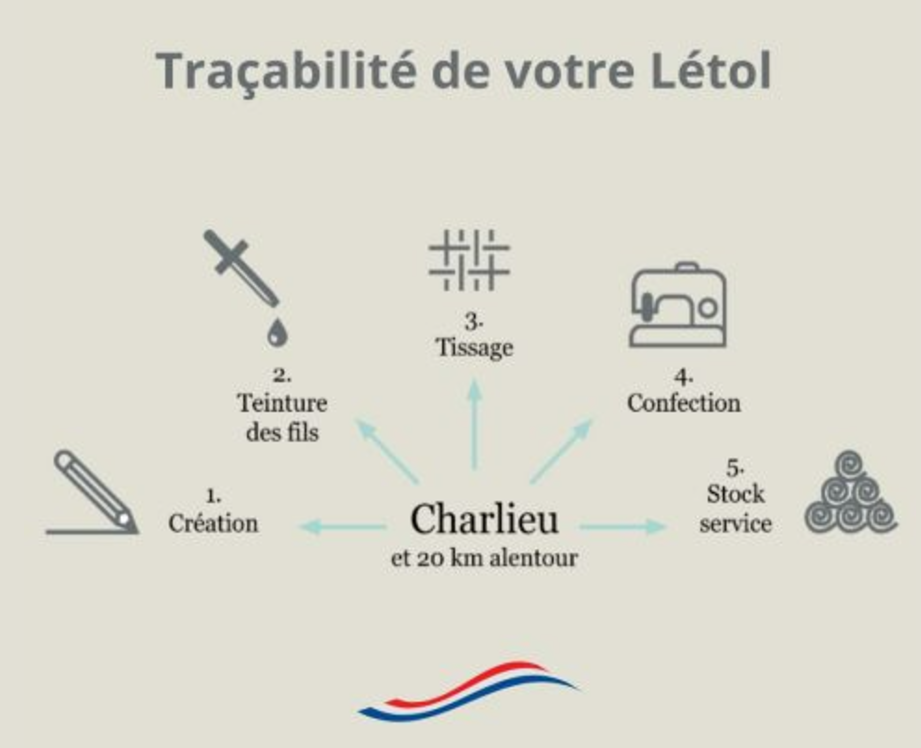 C’est à Charlieu, une petite ville du nord de la Loire et terre de tissage depuis des siècles, que les étoles Létol sont créées, tissées et confectionnées au sein de la société « Les tissages de Charlieu », labellisée Entreprise du Patrimoine Vivant.