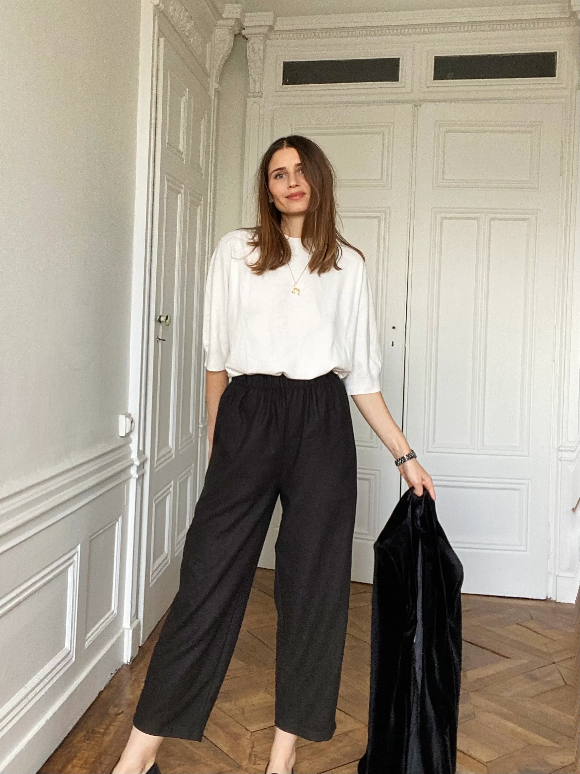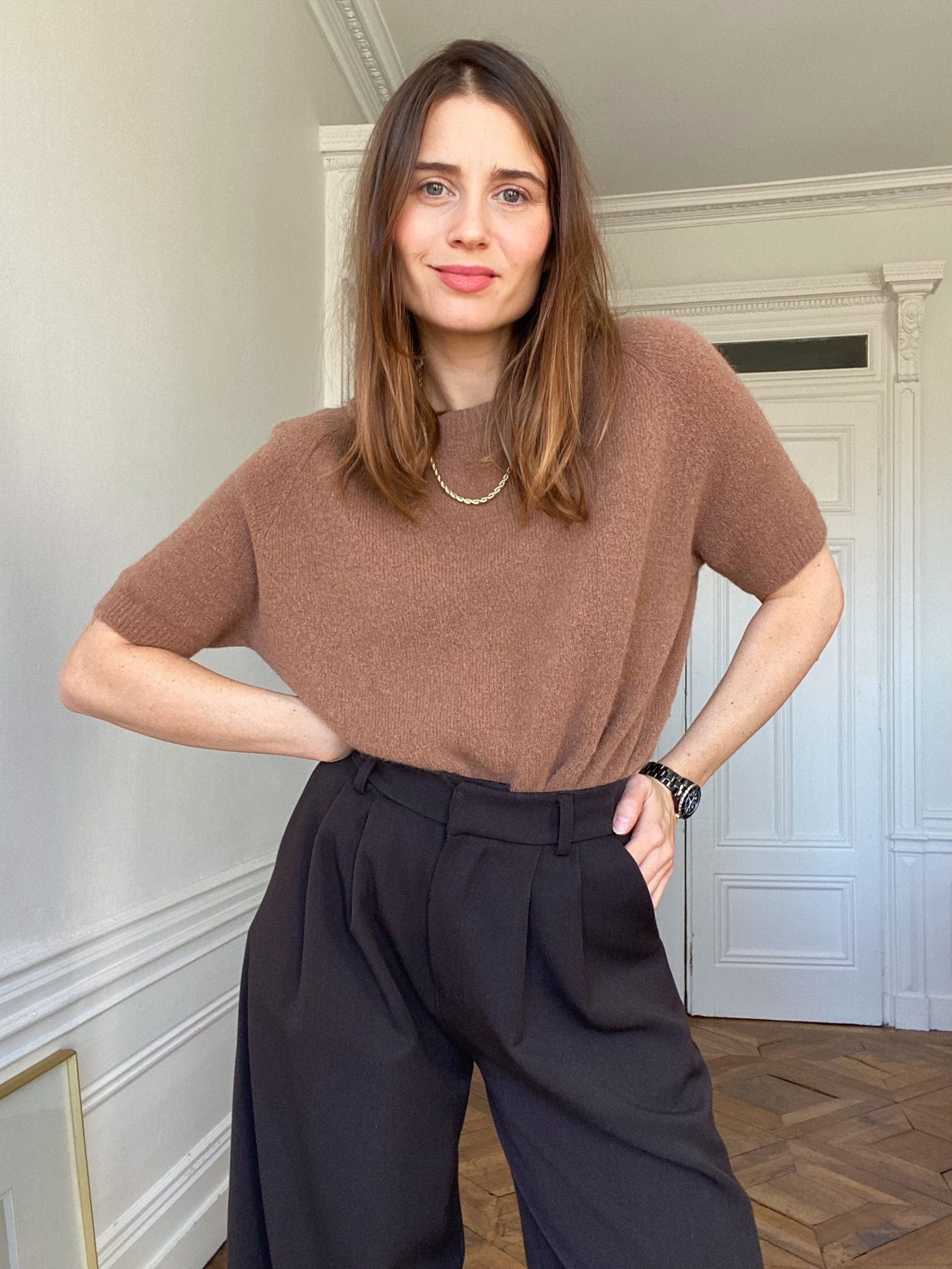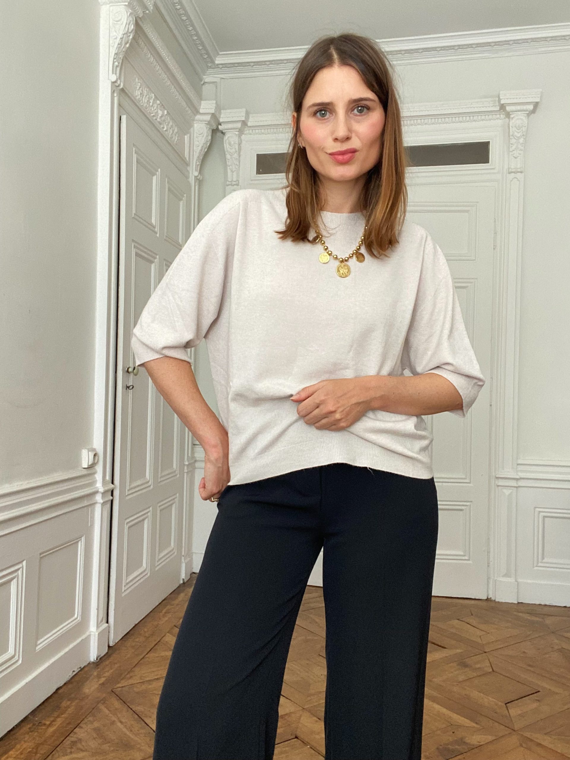 Le haut Émérance combine confort et raffinement avec une matière douce rappelant celle d’un pull léger, tout en adoptant une coupe tee-shirt oversize ultra-tendance.