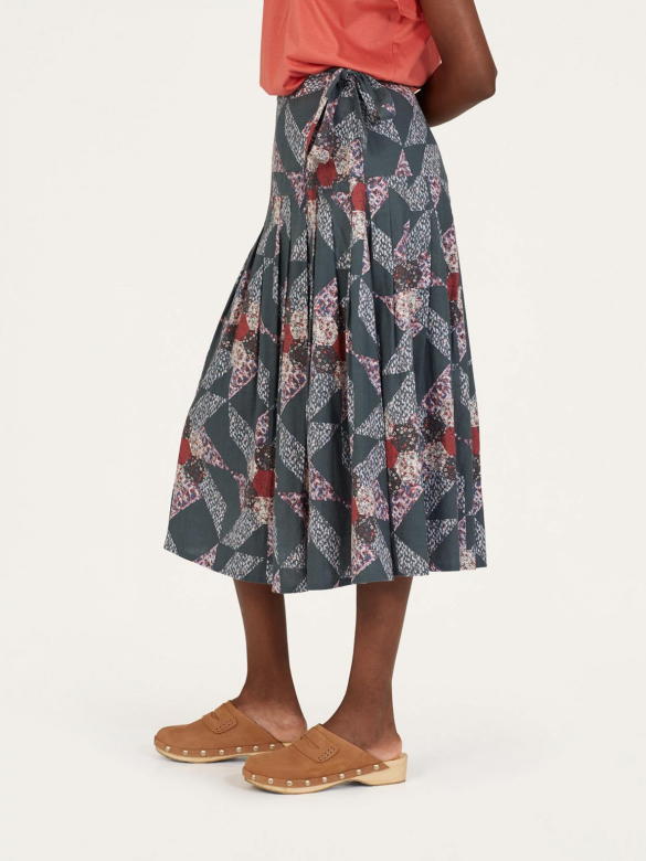 Devant plissé flatteur, longueur midi, taille nouée sur le côté.