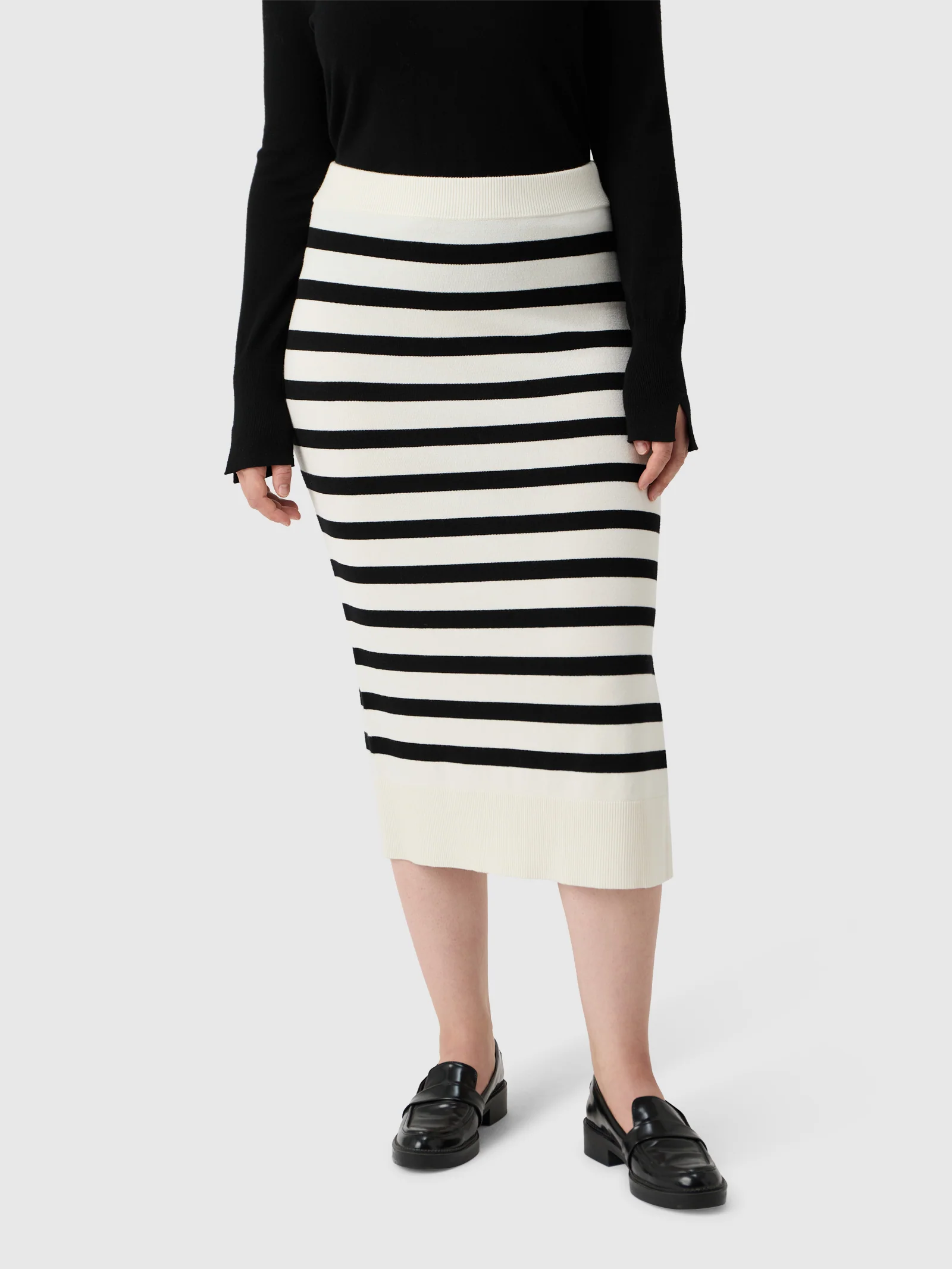 Notre jupe Liia est une jupe midi finement tricotée qui incarne un design classique et une élégance intemporelle. Sa ceinture élastique garantit un enfilage et un retrait faciles tout en assurant une silhouette ajustée. Le bord finement côtelé et la fente élégante sur le côté ajoutent une touche stylée à la jupe. Fabriquée dans un mélange de viscose doux et confortable, cette pièce quotidienne complète parfaitement votre garde-robe. Jouez avec différentes combinaisons en assortissant notre jupe Liia avec le pull Liia, que ce soit en ton sur ton ou en mixant avec des rayures.