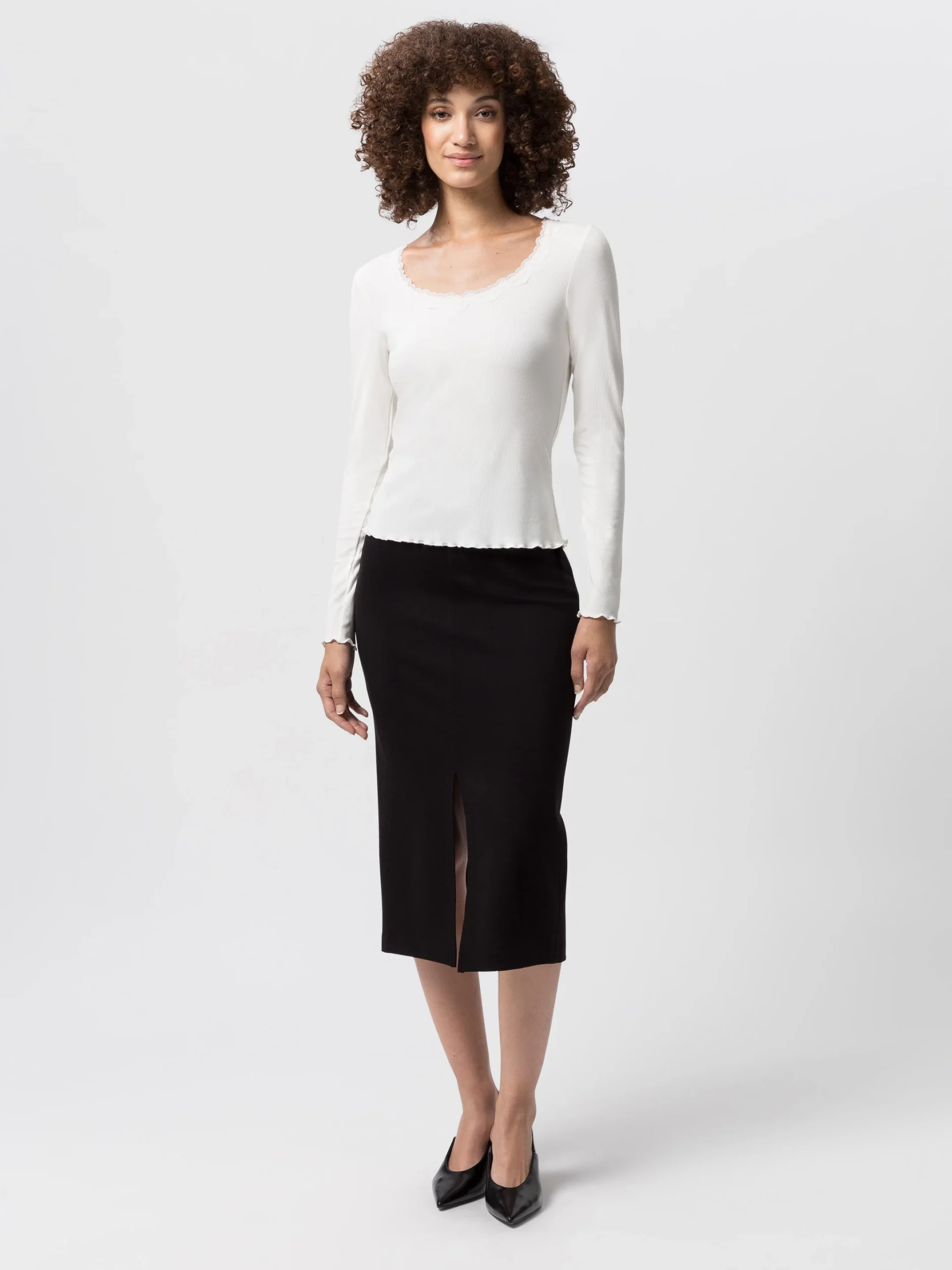 Découvrez la jupe Riika – l’alliance parfaite d’élégance et de confort. Avec sa taille haute flatteuse et sa coupe ajustée, cette jupe midi met parfaitement en valeur votre silhouette. Les fentes discrètes à l’avant et à l’arrière offrent plus de liberté de mouvement et un look moderne. Confectionnée dans un mélange de viscose de haute qualité, le tissu interlock ultra-doux sculpte votre silhouette tout en vous offrant un confort optimal tout au long de la journée. Le zip invisible à l’arrière et les jolies surpiqûres décoratives complètent le design, faisant de la jupe Riika un incontournable de votre garde-robe. C’est la jupe idéale pour apporter une touche de style sans effort – que ce soit au quotidien ou pour des occasions spéciales !