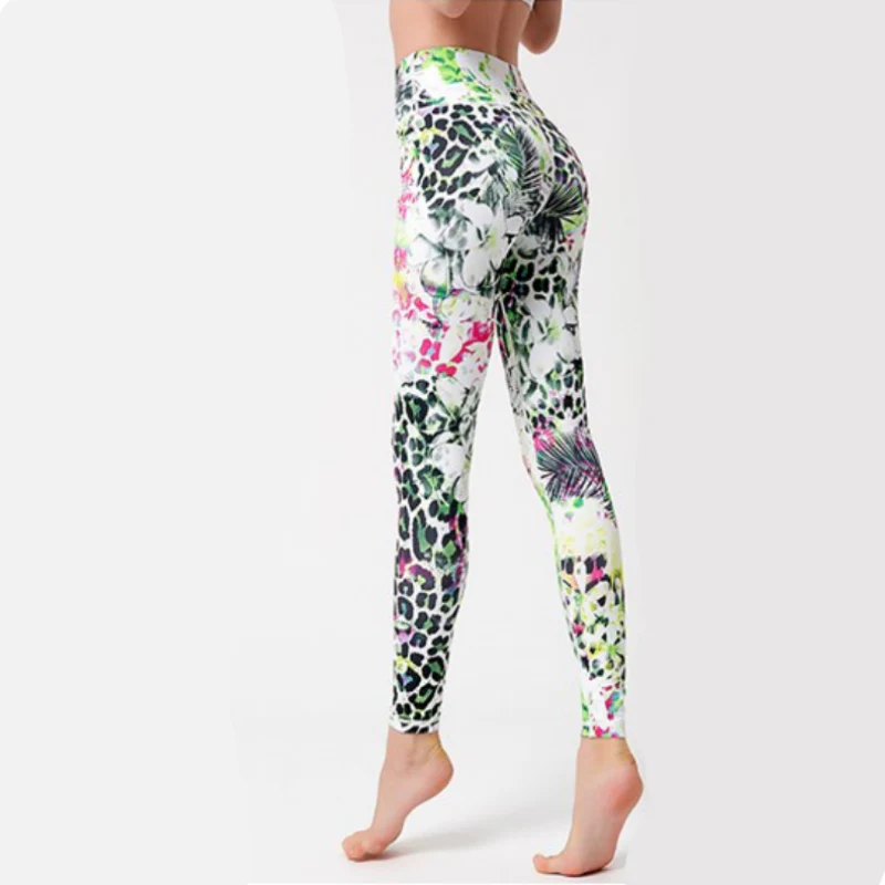 Legging de yoga vert avec motifs fleurs et peau de léopard