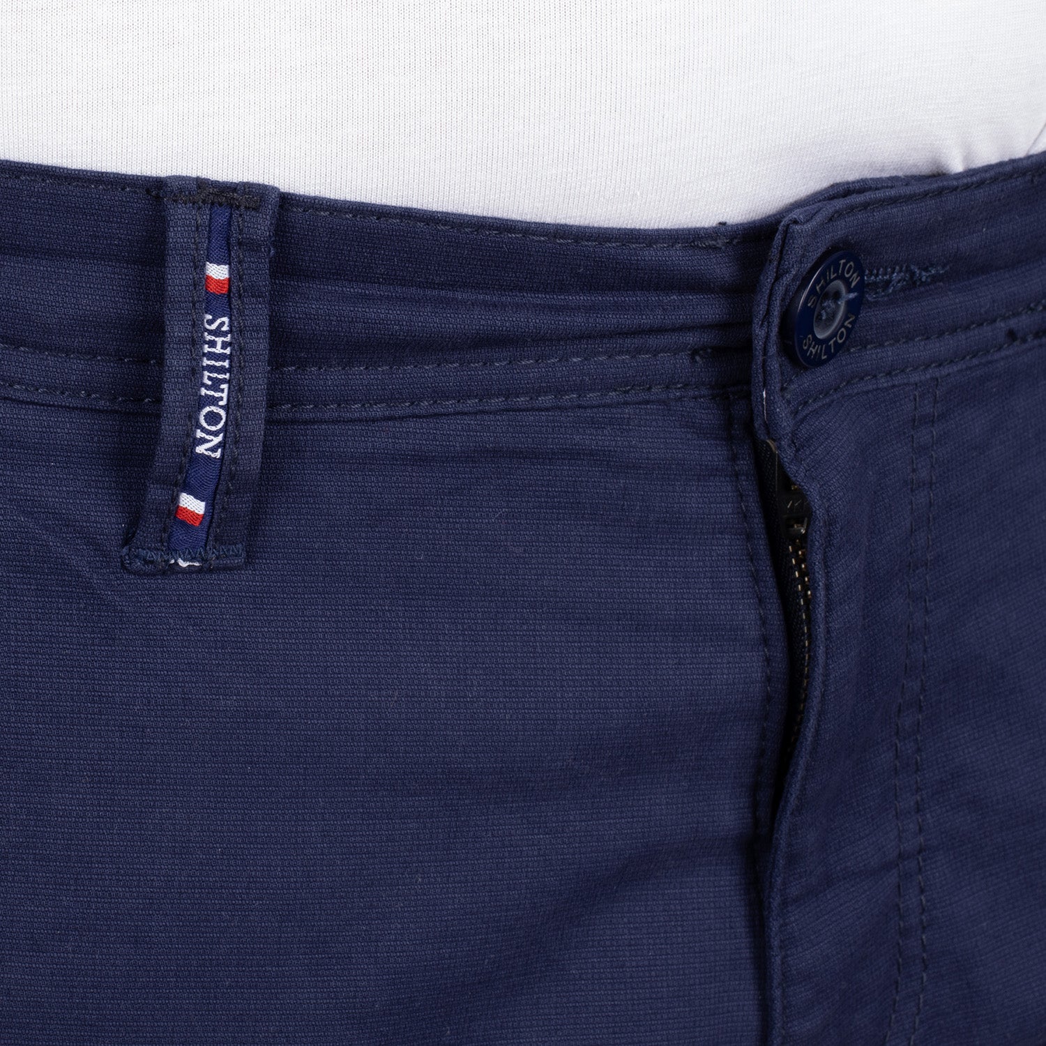 • Détail Shilton bleu, blanc, rouge sur 1 passant de ceinture à l’avant et 1 à l’arrière