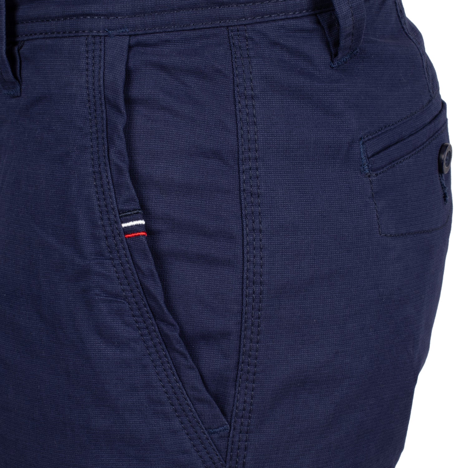 • Liserés bleu, blanc, rouge sur le bord de la poche avant gauche