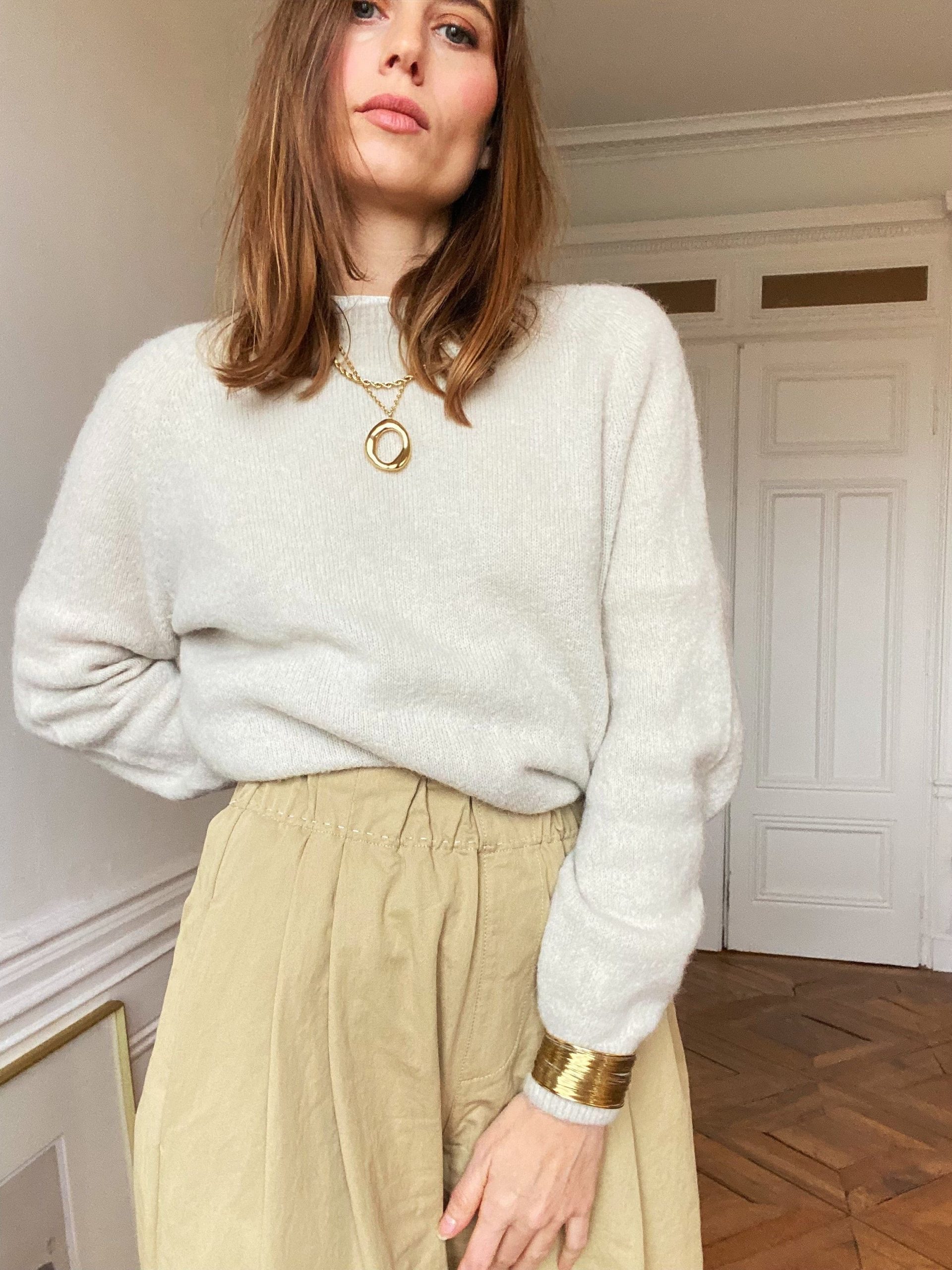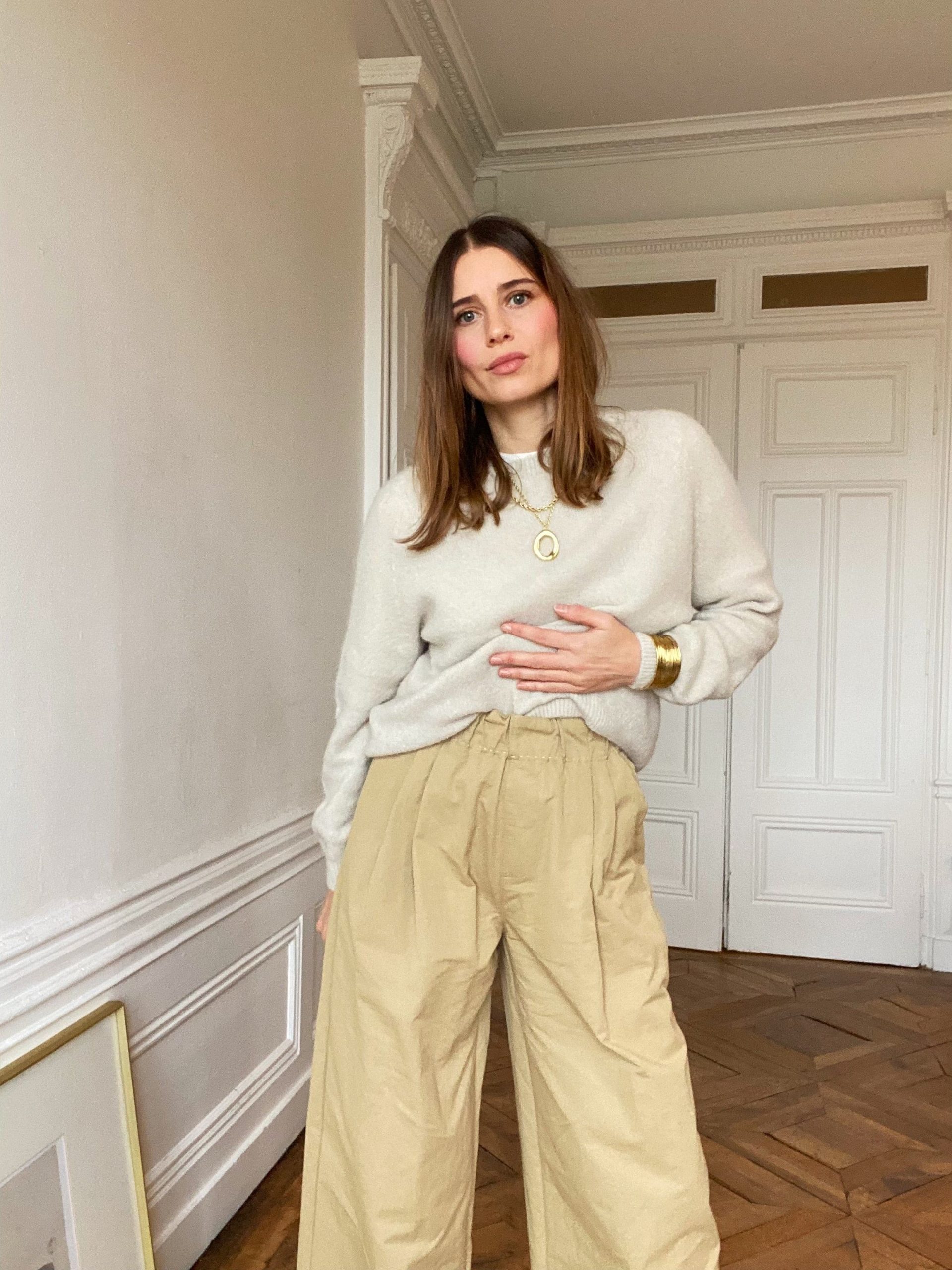 Le pantalon Elisabeth est conçu dans une toile de coton beige enduite, qui lui apporte une tenue structurée et un rendu très chic. Sa coupe très large et ses gros plis sur le devant lui donnent un volume moderne et sophistiqué, tout en créant une allure forte et pleine de caractère.