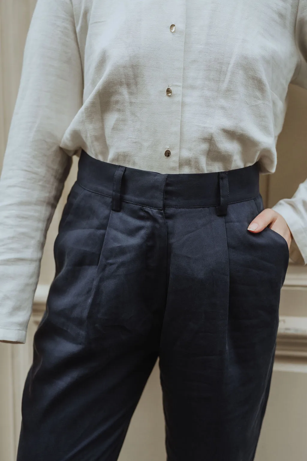 Le pantalon fluide Berlin est parfait en toute saison. Sa forme carotte est idéale pour être à l’aise pour un moment détente ou plus officiel car elle laisse les jambes libres tout en ayant un tombé très élégant.