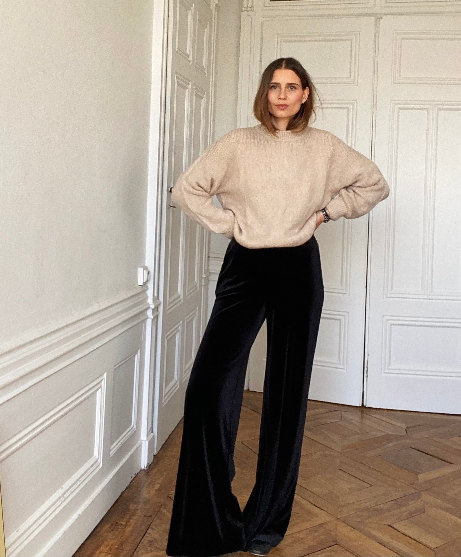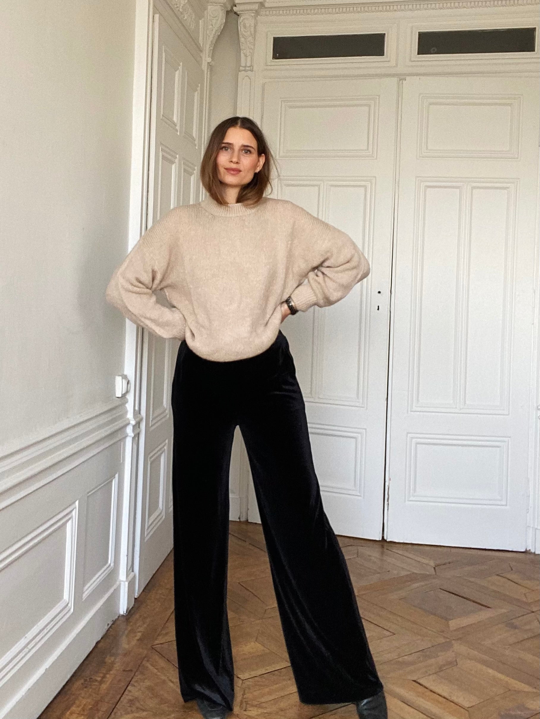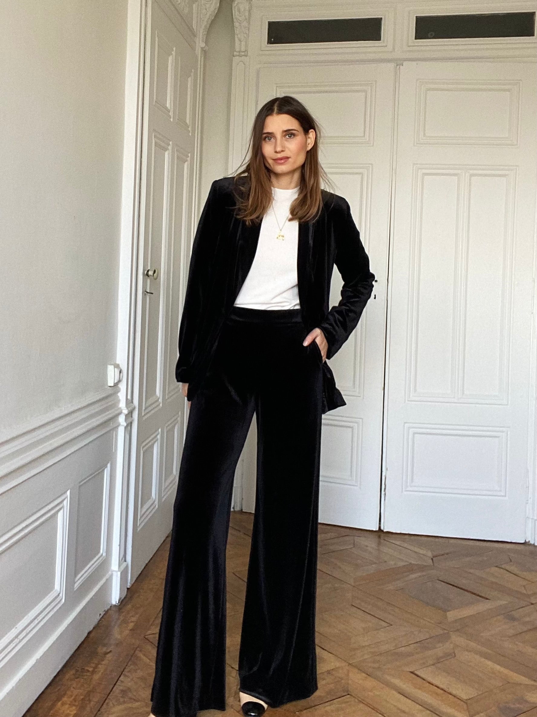 Le pantalon Pia est un pantalon en velours à la coupe ample et fluide, pensé pour allonger la silhouette. Sa jambe ne colle jamais, ce qui lui donne un tombé élégant et met la ligne de la jambe en valeur sans la mouler.