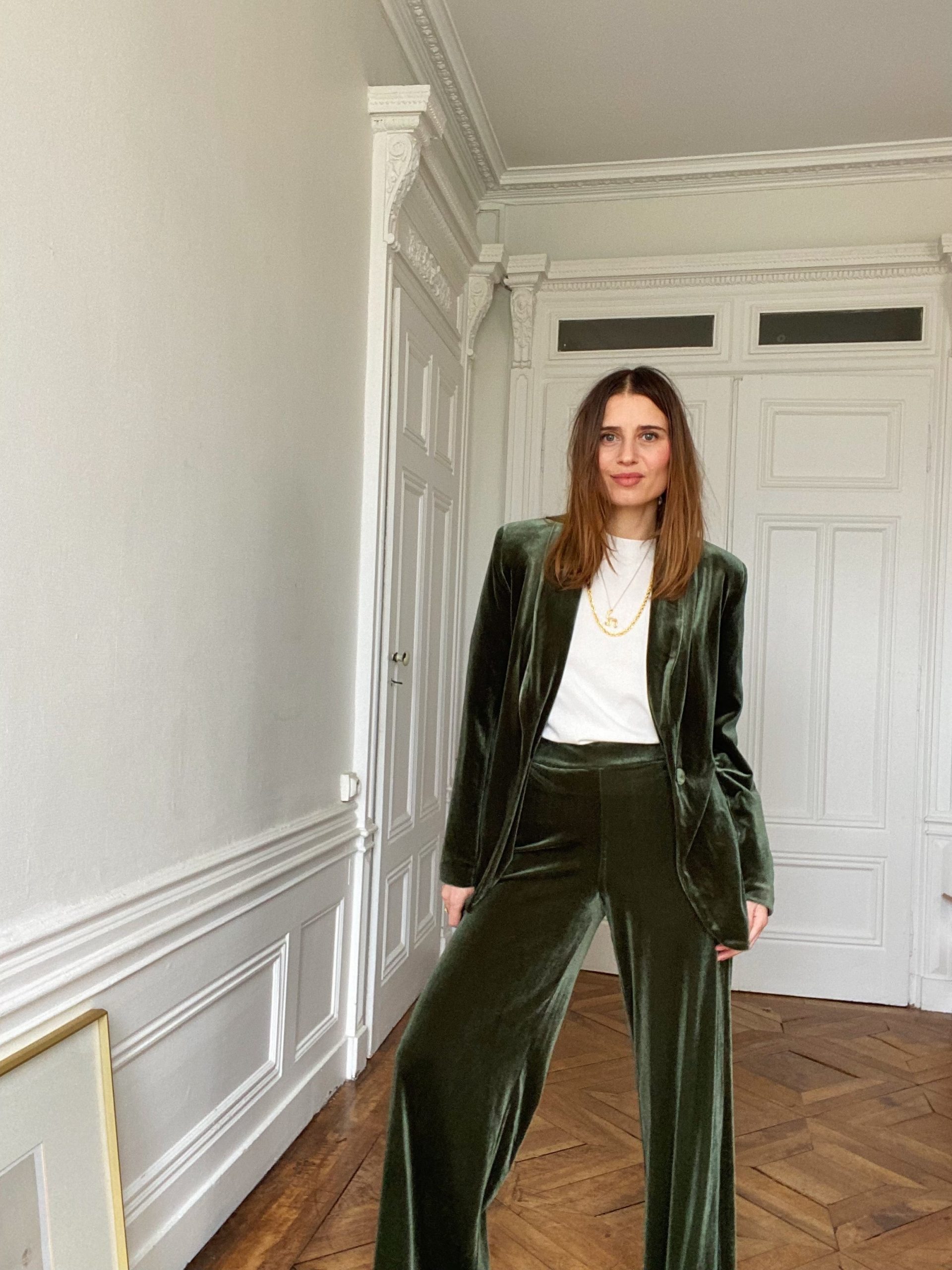 Le pantalon Pia est un pantalon en velours à la coupe ample et fluide, pensé pour allonger la silhouette. Sa jambe ne colle jamais, ce qui lui donne un tombé élégant et met la ligne de la jambe en valeur sans la mouler.