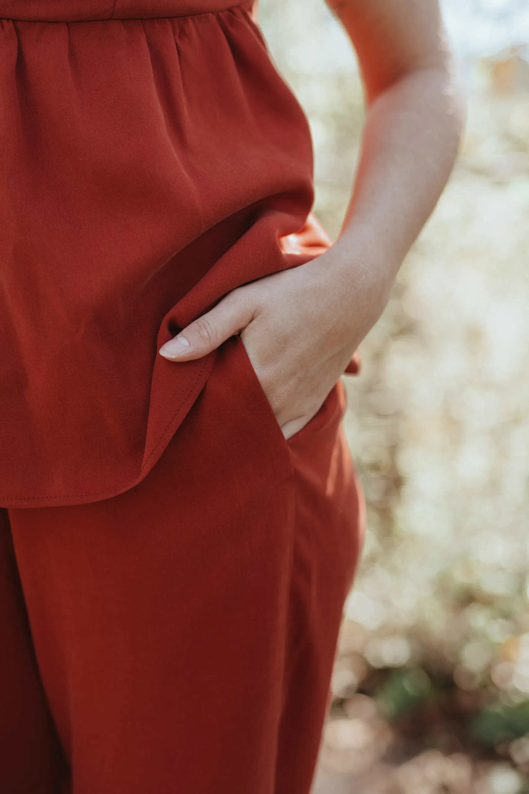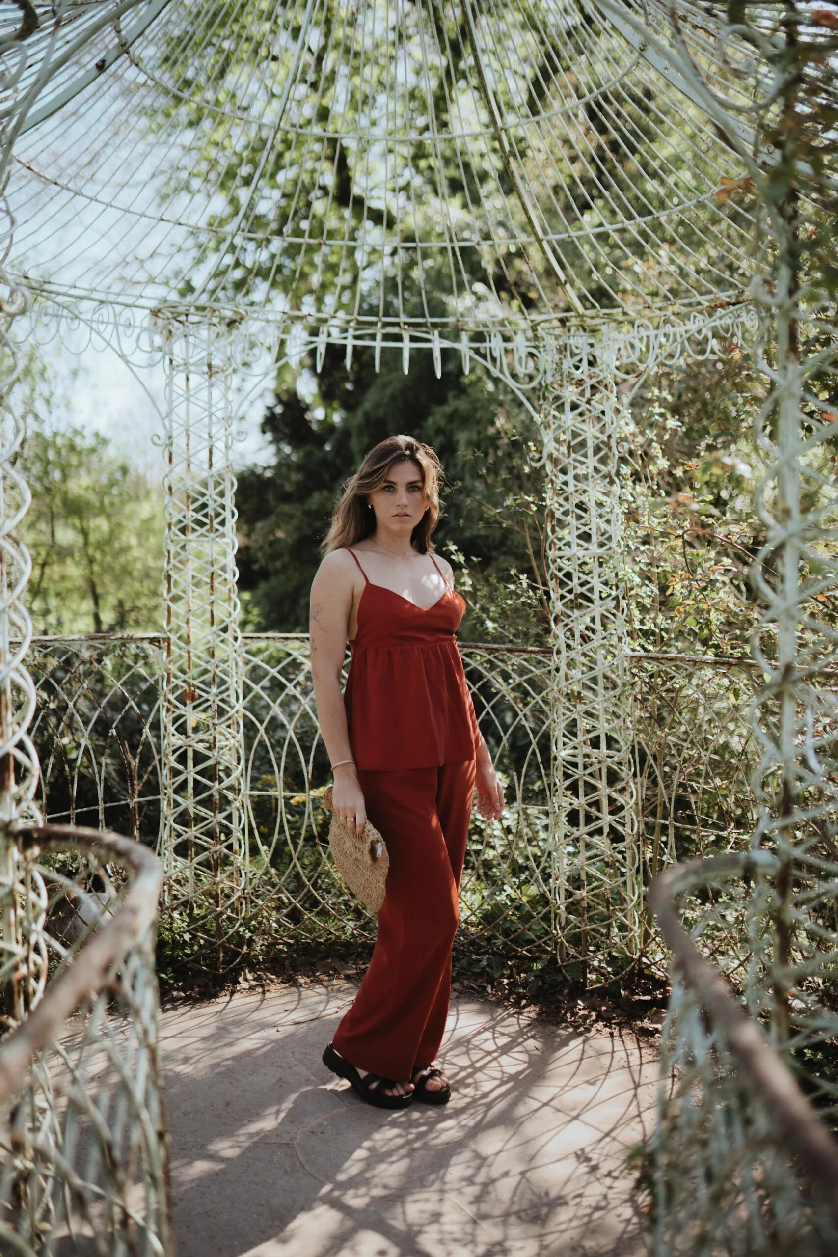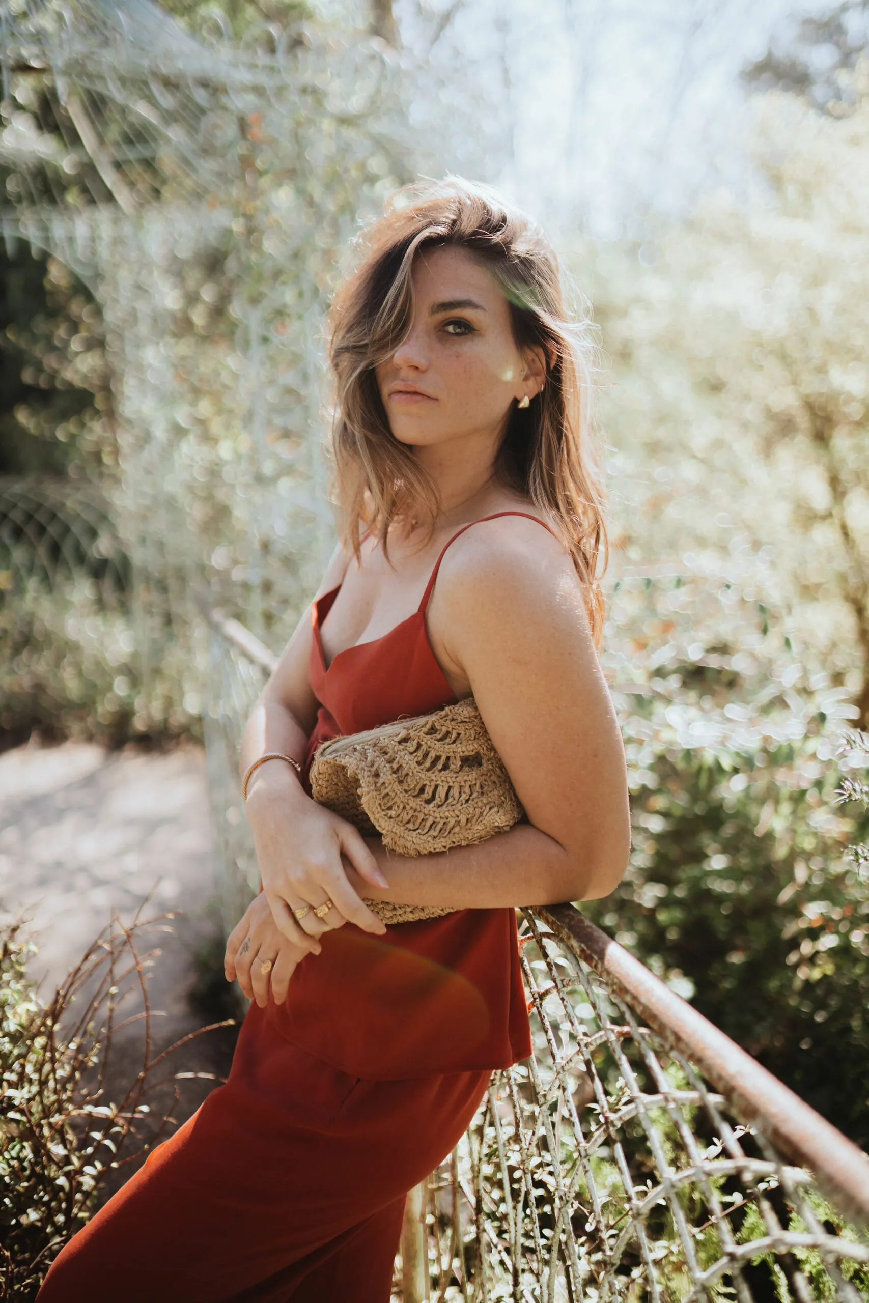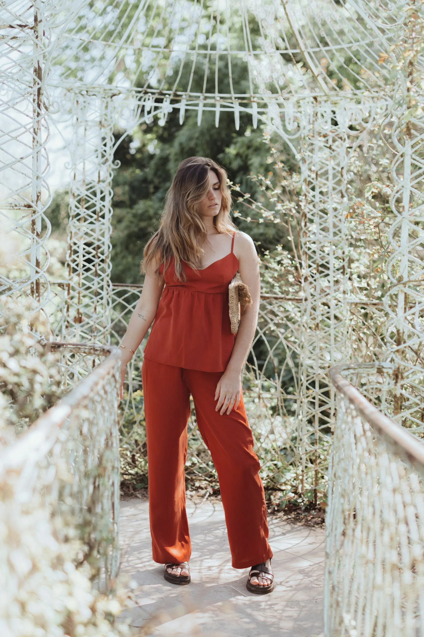 Le pantalon terracotta Positano s’adapte à une multitude de styles et de moments, grâce à sa couleur vibrante et à sa coupe aérienne.