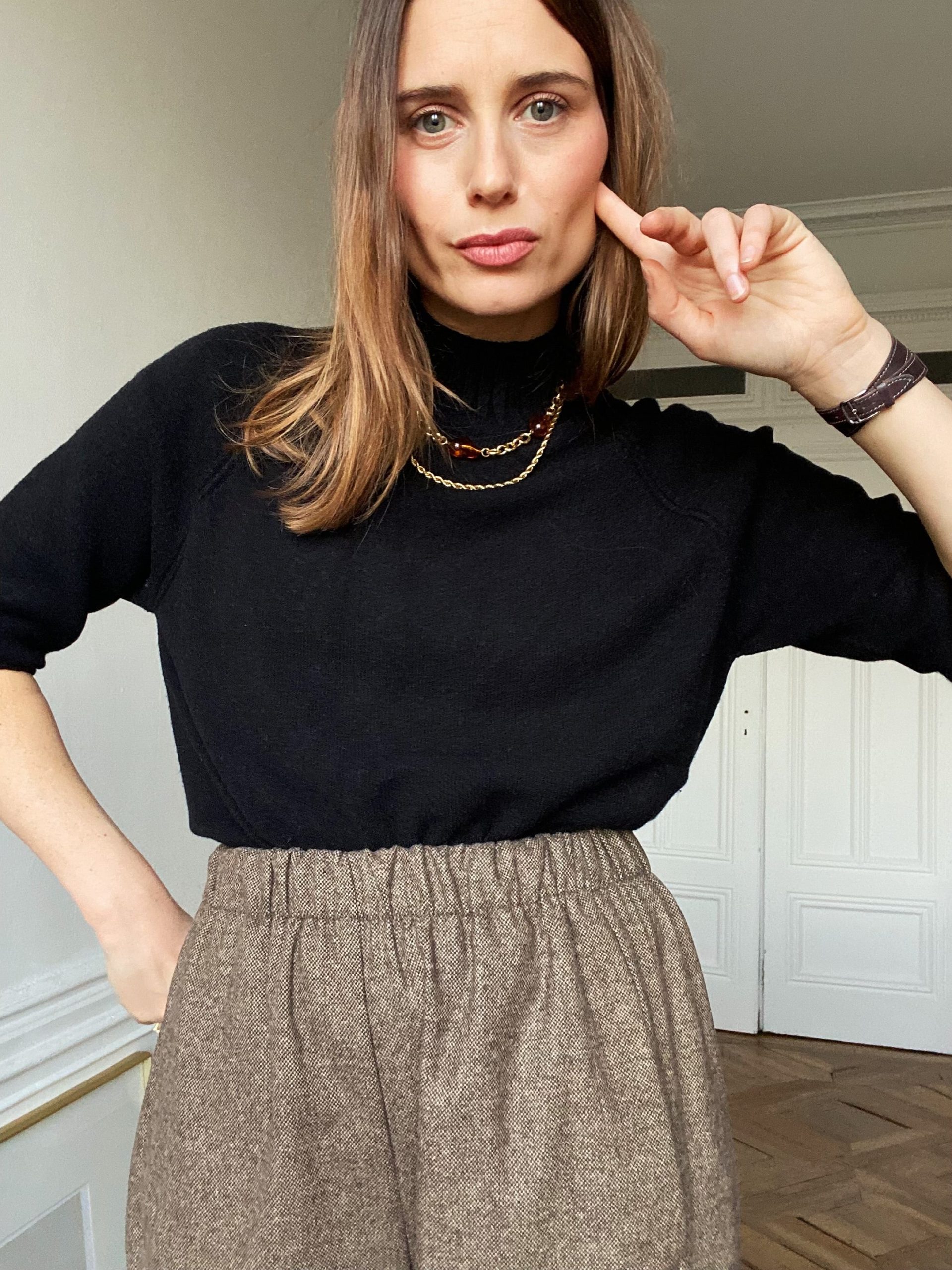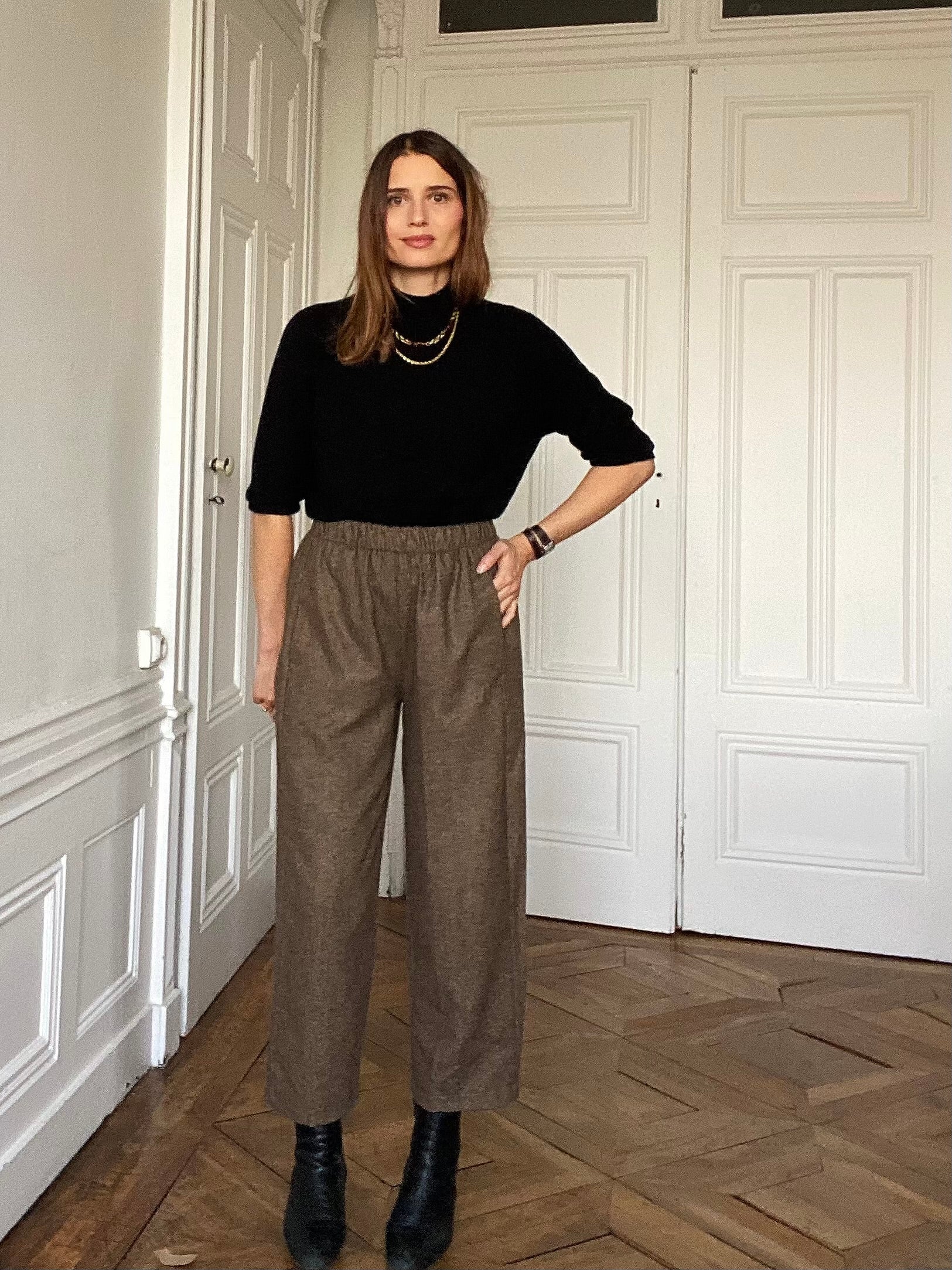 Le pantalon Solal revisite l’allure tailleur avec une touche contemporaine. Sa coupe carotte et sa taille élastiquée apportent confort et modernité, tandis que sa jambe légèrement raccourcie à la cheville donne une allure affirmée et actuelle.