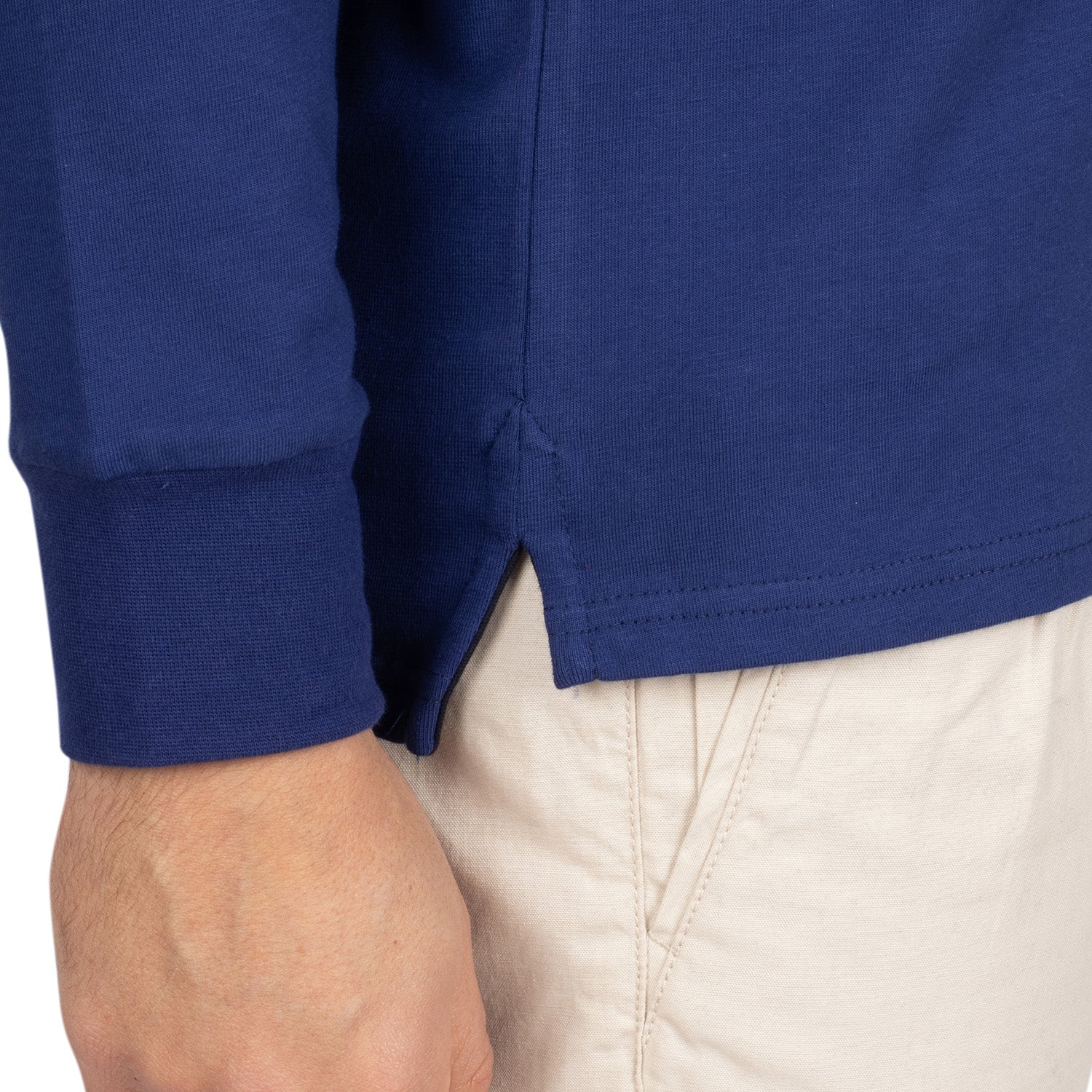 - Liseré blanc sur le bord-côte des manches et bas du col