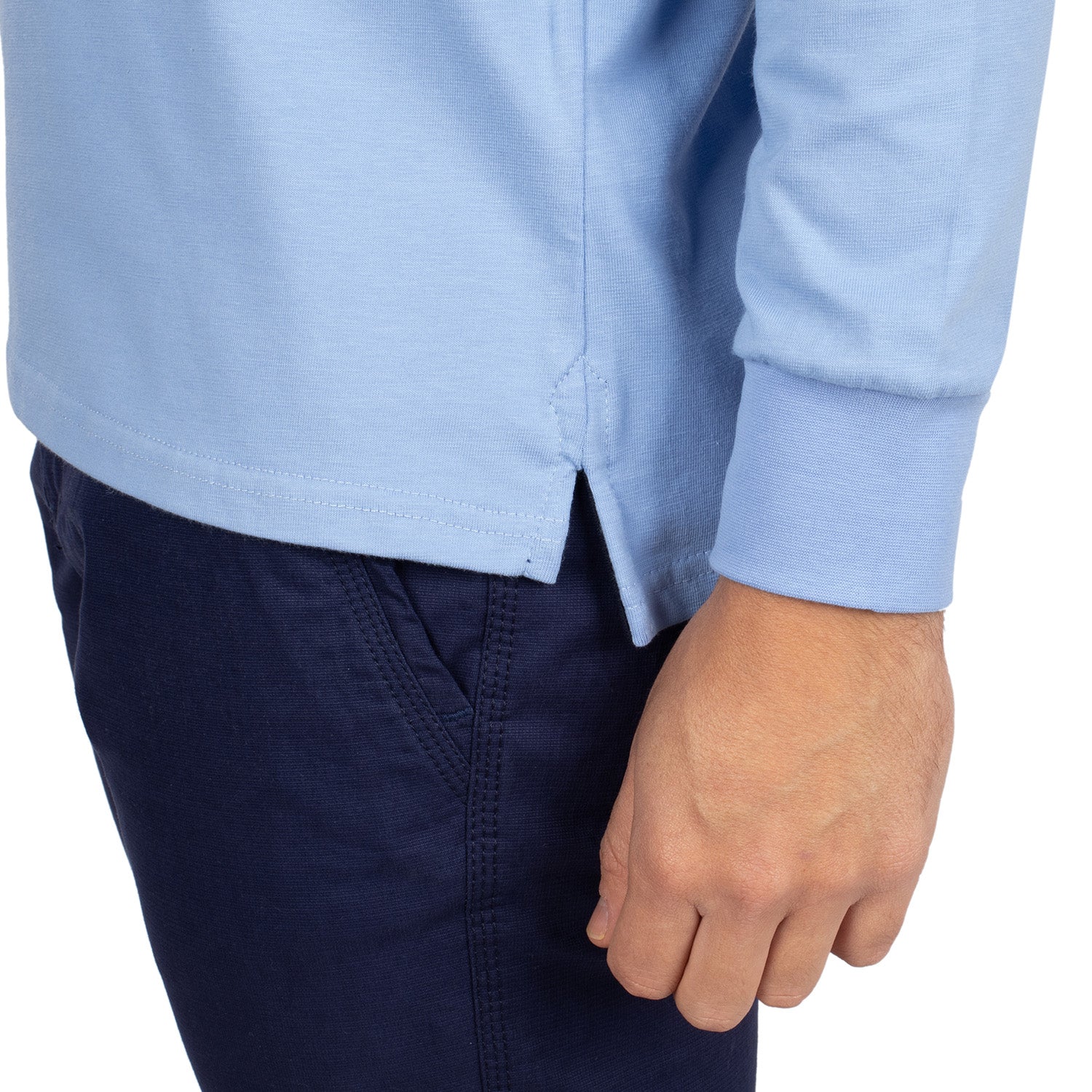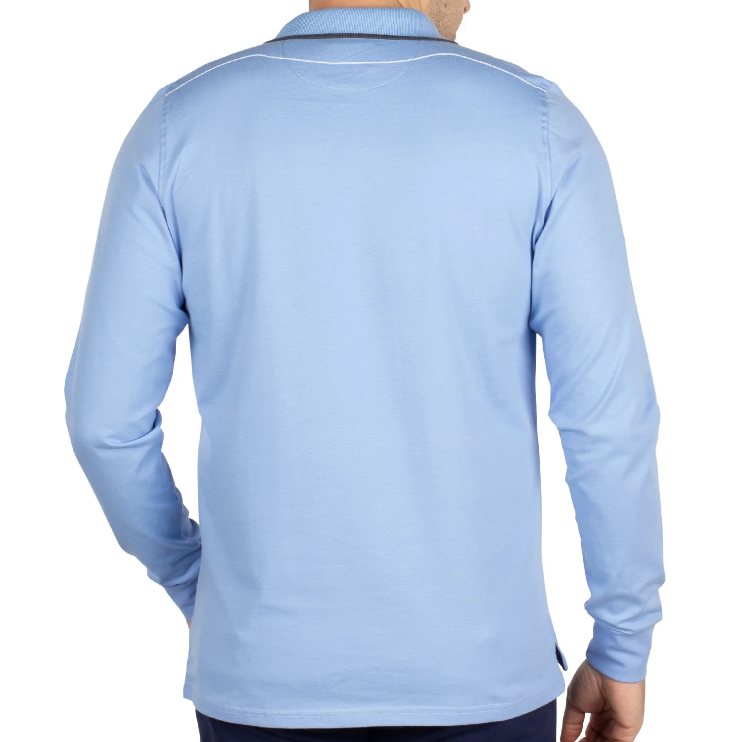 - Liseré blanc sur le bord-côte des manches et bas du col