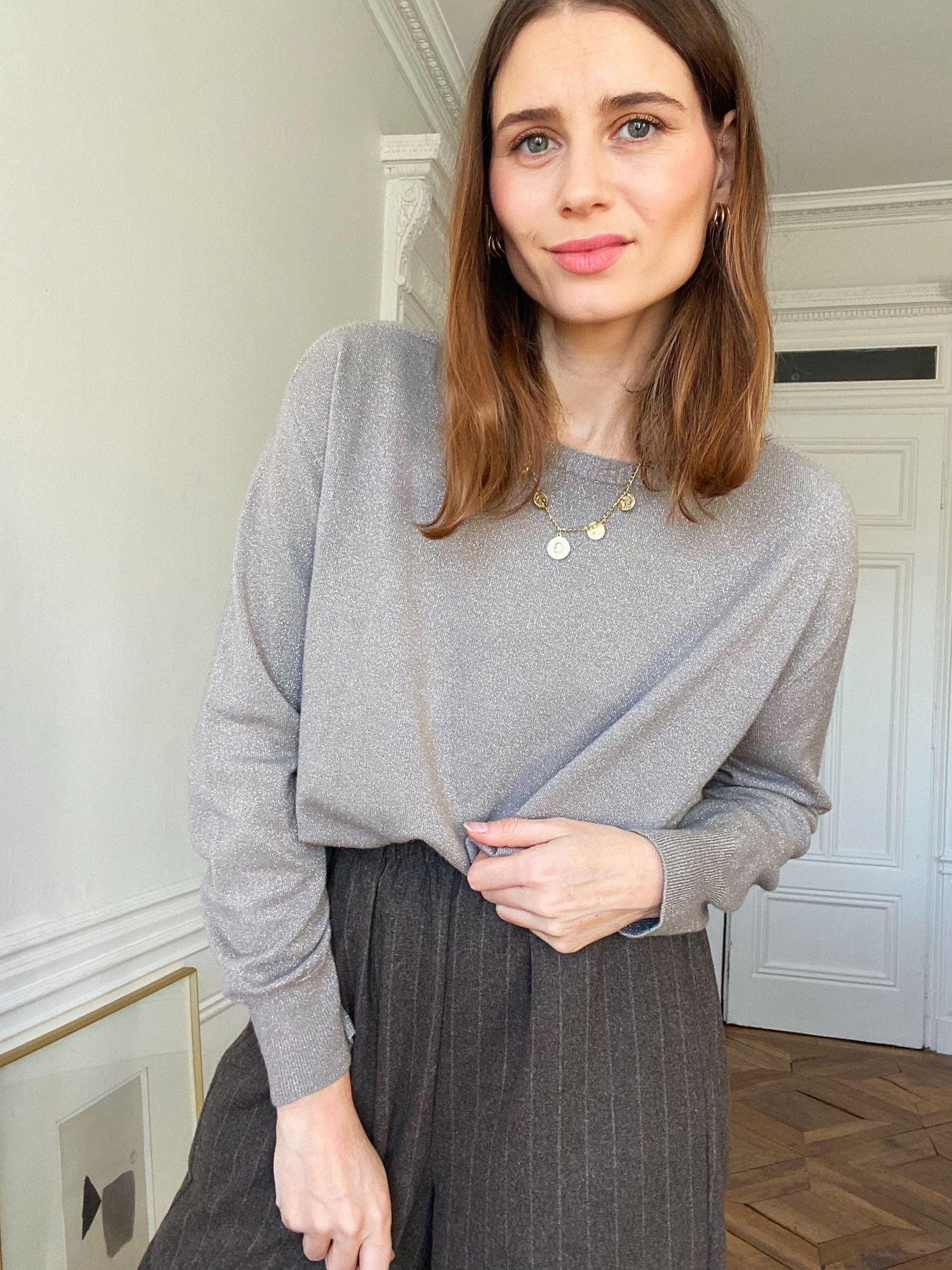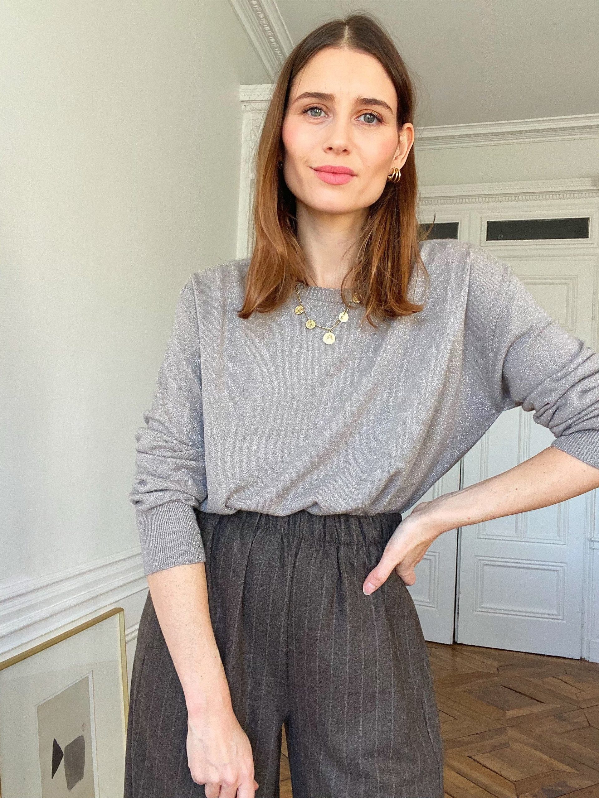 Le pull Gaïa est un pull fin gris clair rehaussé de fils de lurex discrets, qui apportent une touche lumineuse sans en faire trop. Avec son col rond et sa coupe épurée, il se distingue par son style chic et minimaliste, parfait pour illuminer une tenue en douceur.
