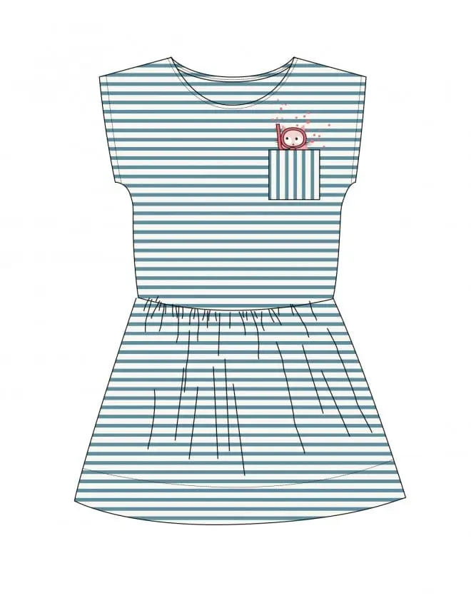En jersey tout doux et confortable, voici une robe enfant 100 % coton BIO certifié GOTS avec ses fines rayures crème et bleu Bretagne. Ouverture pressionnée au dos en 24 mois uniquement pour faciliter l’habillage des plus petits. Poche avec sérigraphie en détail.
