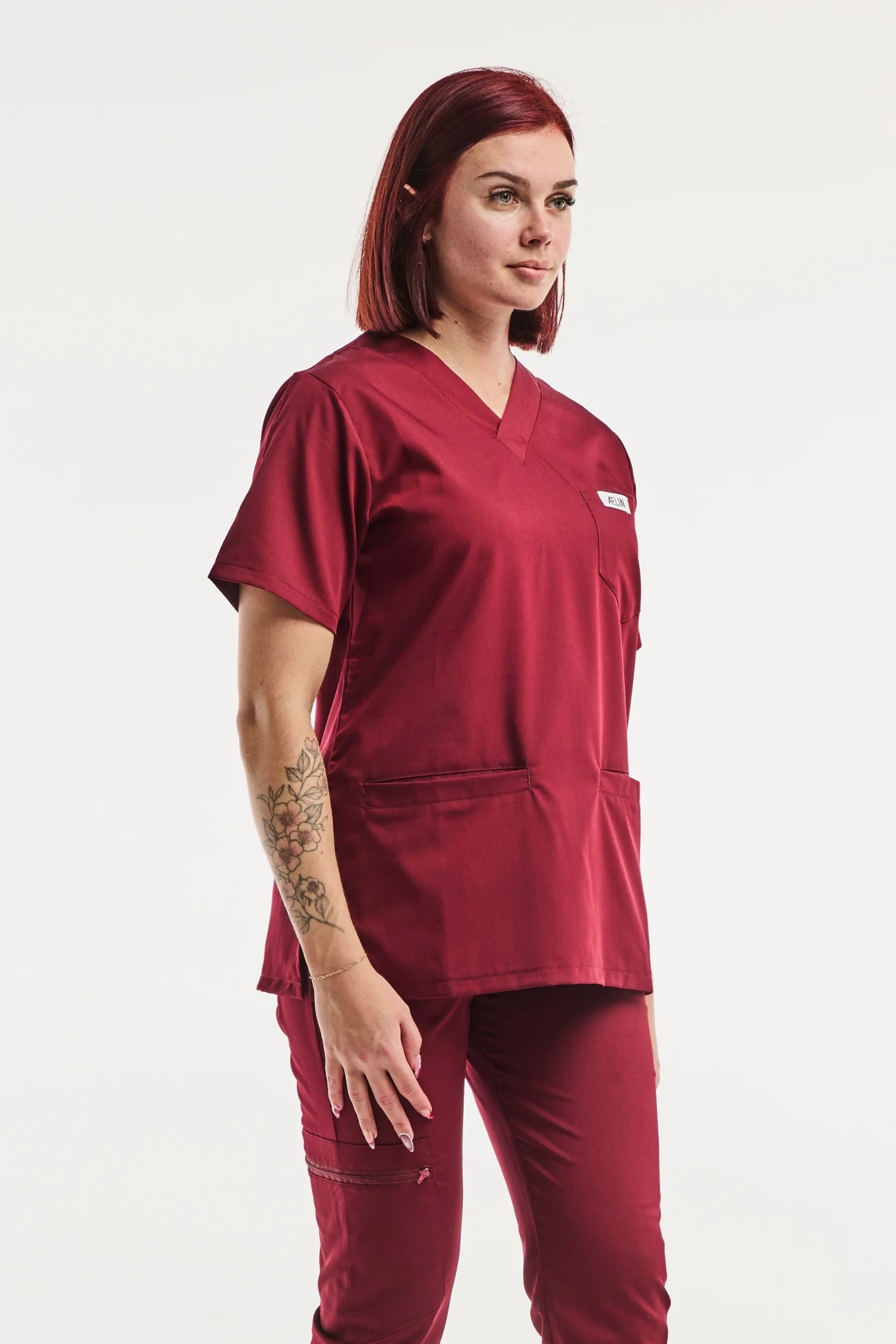 - Description : manches courtes, col V, 3 poches.