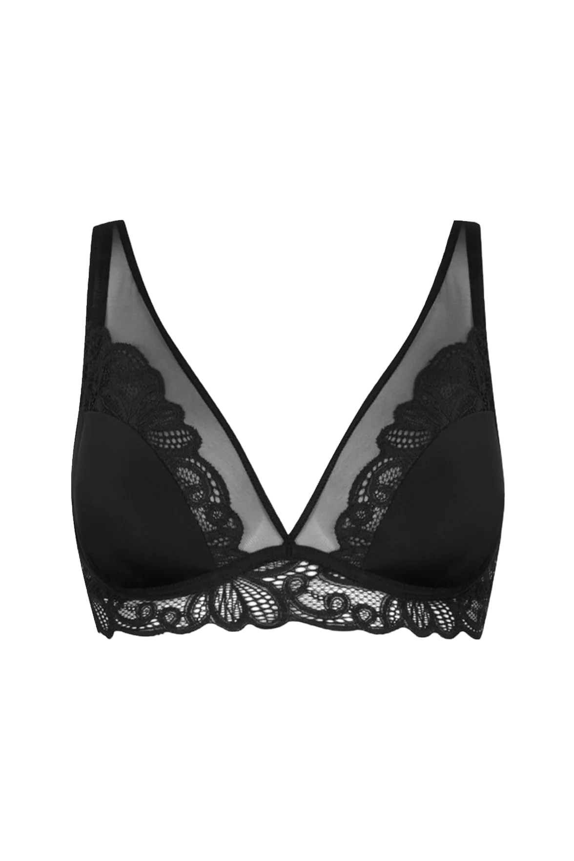 La forme foulard de ce soutien-gorge à demi-coques avec armatures est rassurante et sensuelle. Les touches de dentelle et de tulle subliment les courbes du corps tout en mettant en valeur le décolleté.