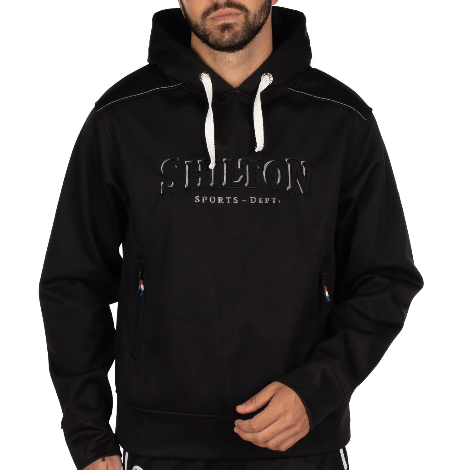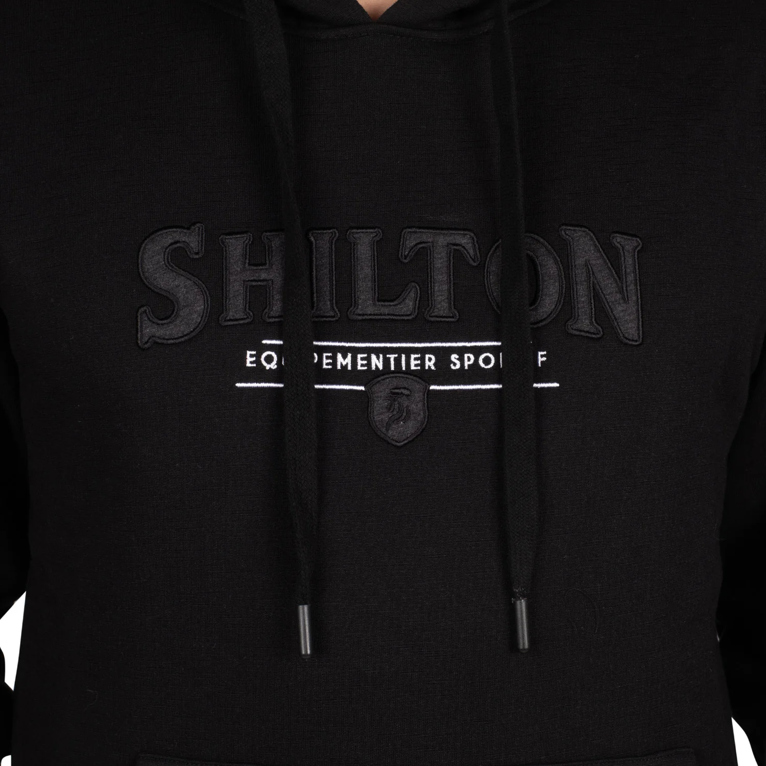 - Broderie Shilton équipementier sportif gris anthracite et blanc sur le torse