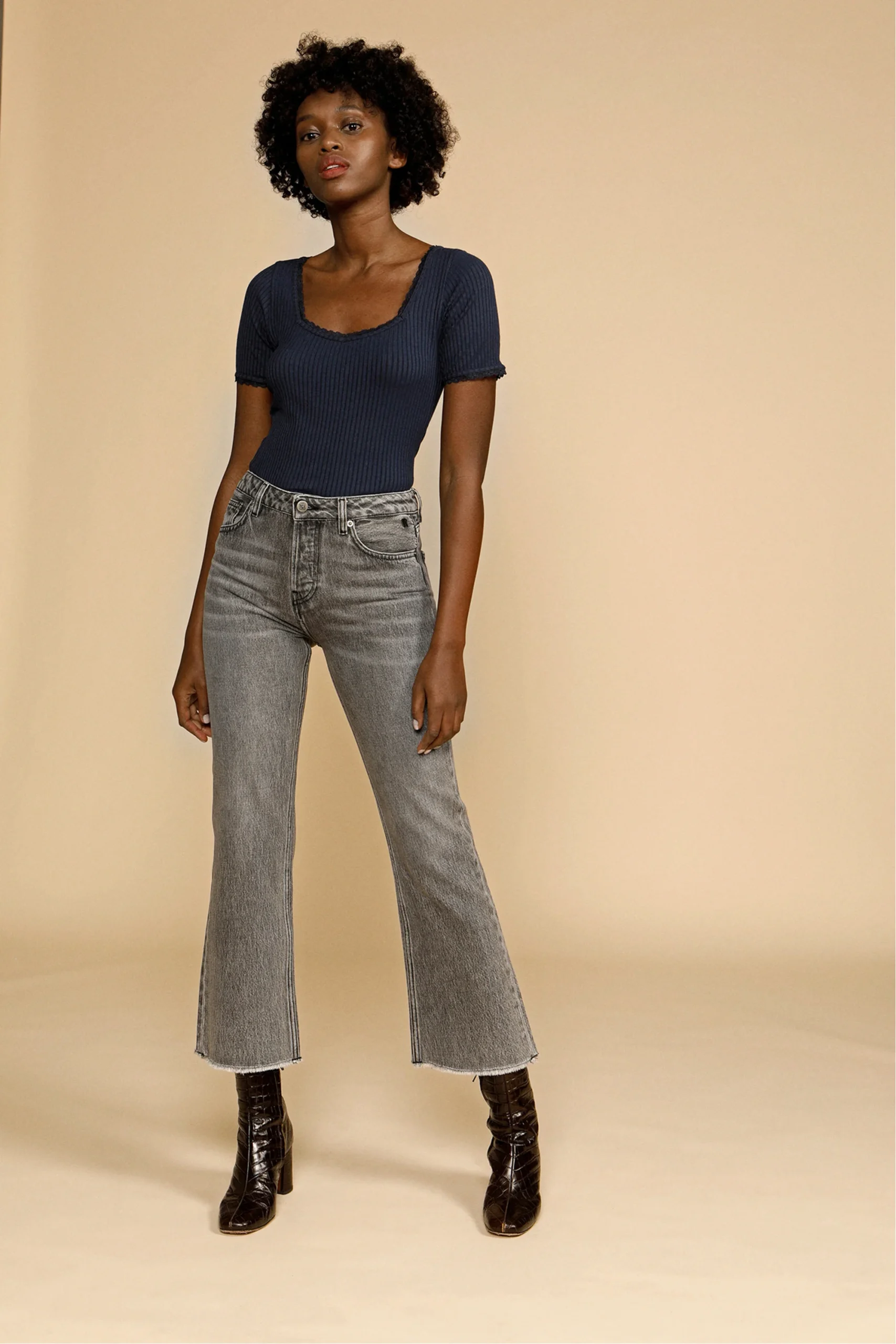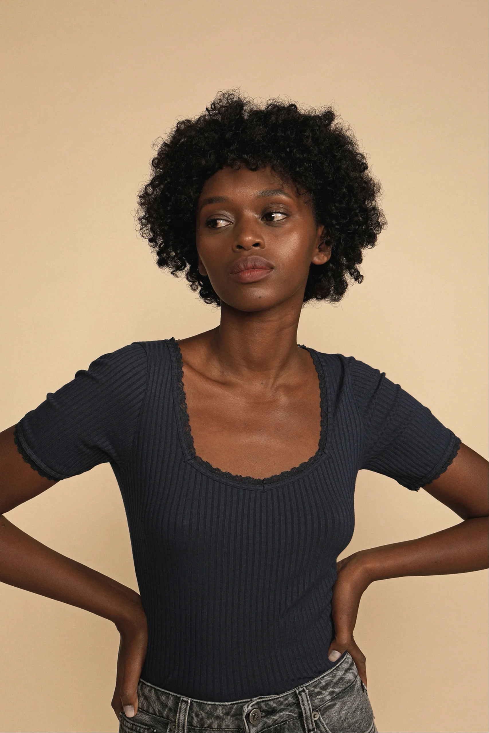 T-shirt près du corps en matière douce. Dentelle au décolleté et sur les manches. Coton côtelé et manches courtes. 95% modal, 5% élasthanne. Lavage en machine à 30° et séchage à l’air libre. Fabriqué au Portugal.