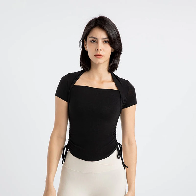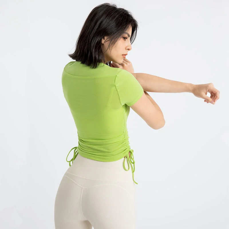 Ce t-shirt de yoga est une pièce féminine et ajustée, rehaussée de délicates ficelles sur les côtés. Cette touche élégante permet un ajustement personnalisé, mettant en valeur la silhouette. Conçu dans un tissu extensible, il offre une liberté de mouvement optimale. Son design met en avant la féminité et l’élégance, en faisant le choix idéal pour les séances de yoga. Ce haut allie parfaitement style et fonctionnalité, ajoutant une note distinctive à votre tenue de yoga. Confortable et tendance, il deviendra rapidement un incontournable de votre garde-robe sportive.