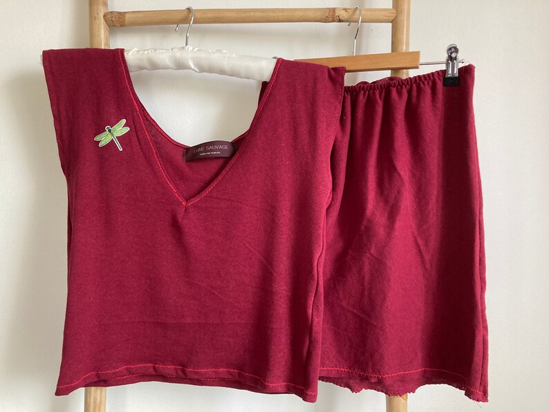 Tee-shirt bordeaux réalisés avec du tissus en chanvre et coton biologique.