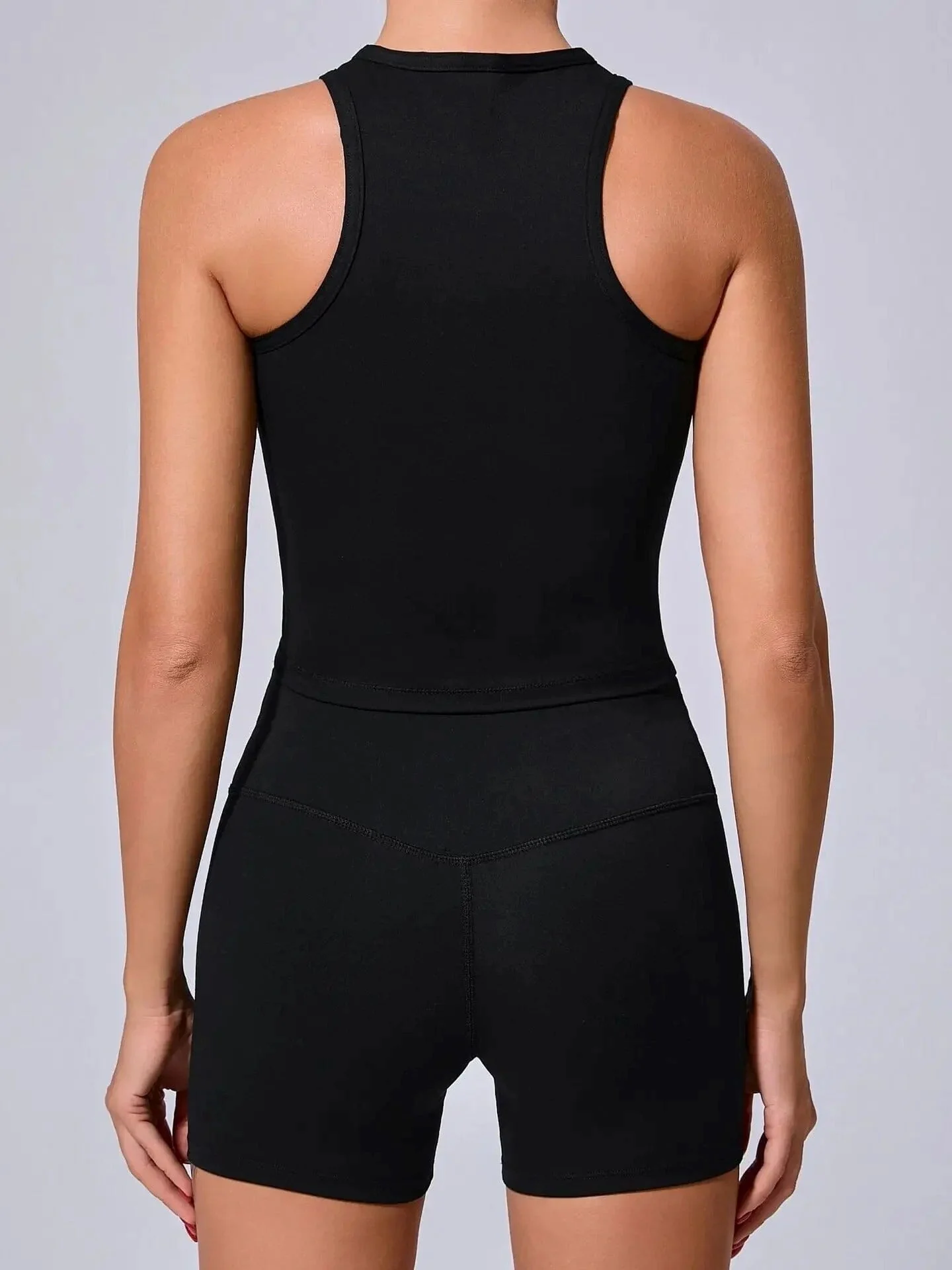 Découvrez la tenue de sport BodySculpt composé d’un short moulant taille haute et d’un top court sans manches au design minimaliste. Conçu pour sublimer la silhouette, cette tenue de sport pour femme offre un maintien optimal et un confort inégalé lors de vos séances de fitness, yoga, ou sorties décontractées.