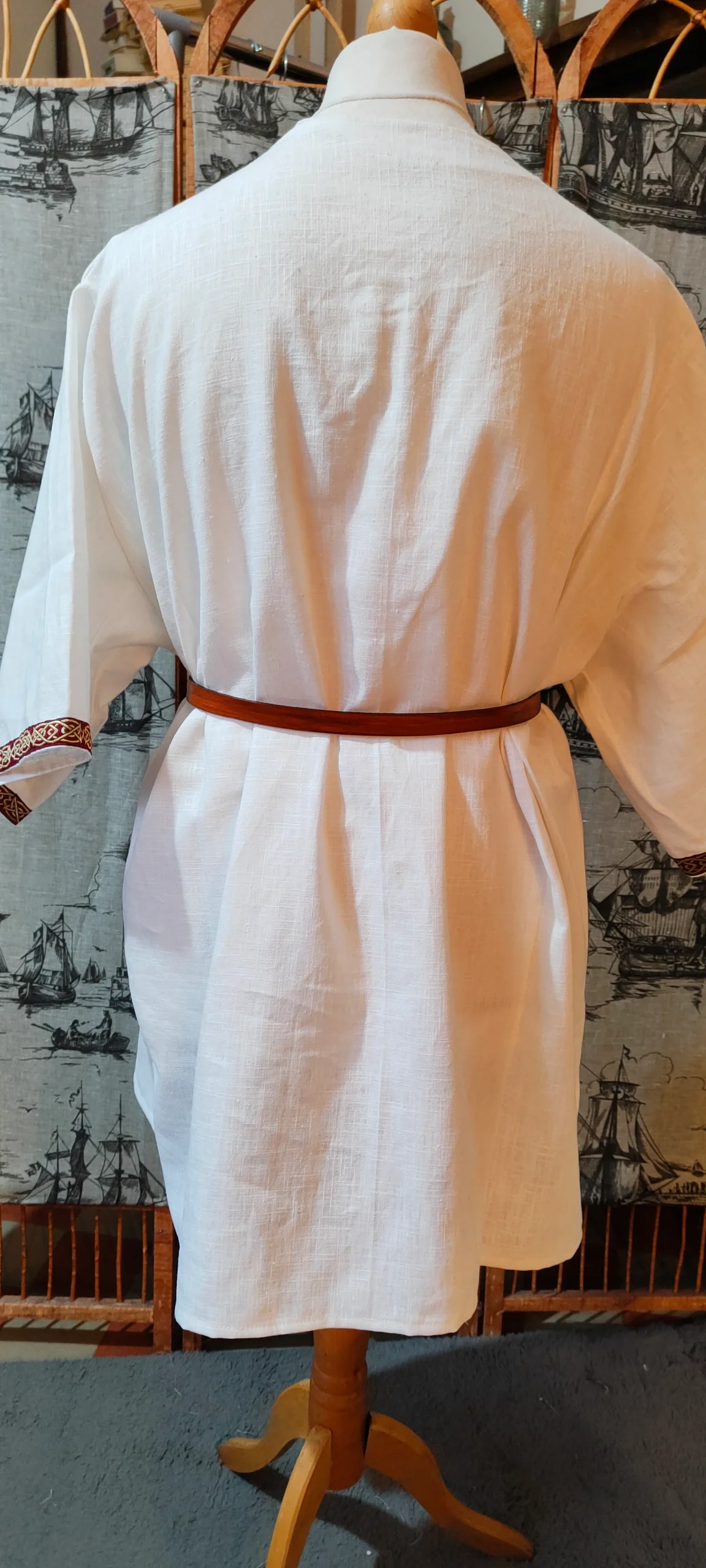 Tunique viking ou médiévale en lin blanc avec manches courtes, galon bordeaux et doré
