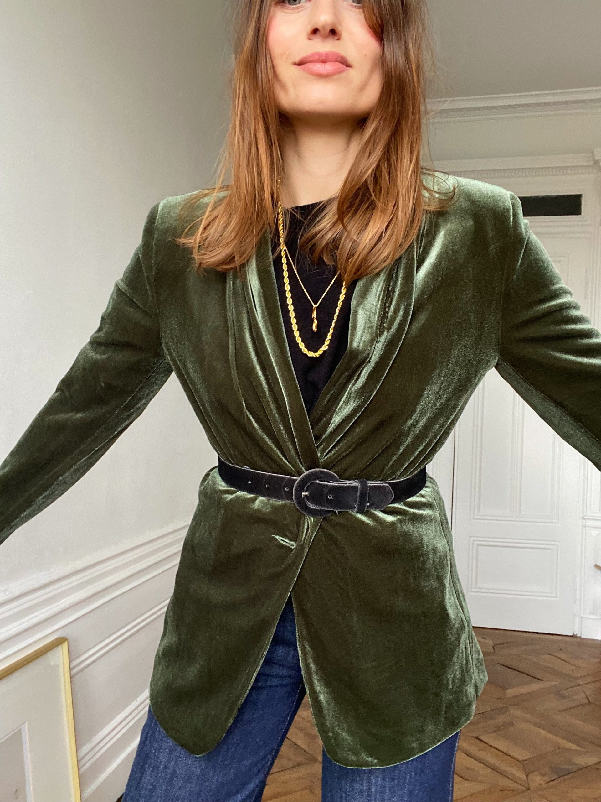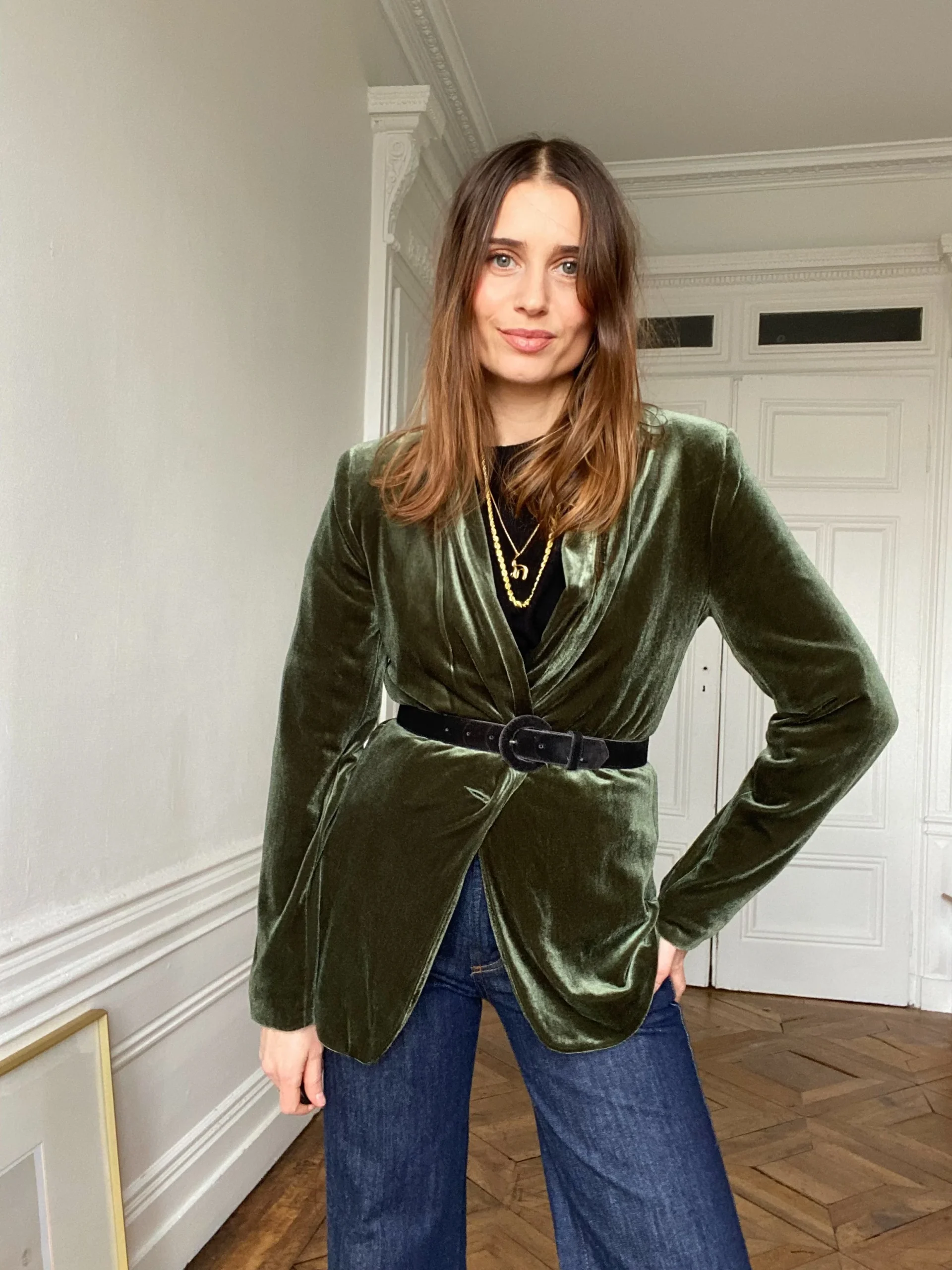 La veste Honorine est une veste de tailleur en velours, pensée pour apporter une touche chic et élégante à la silhouette. Son coupe ajustée structure le haut du corps et crée un contraste raffiné avec un pantalon ample, notamment avec le pantalon Pia, pour un ensemble moderne et féminin.