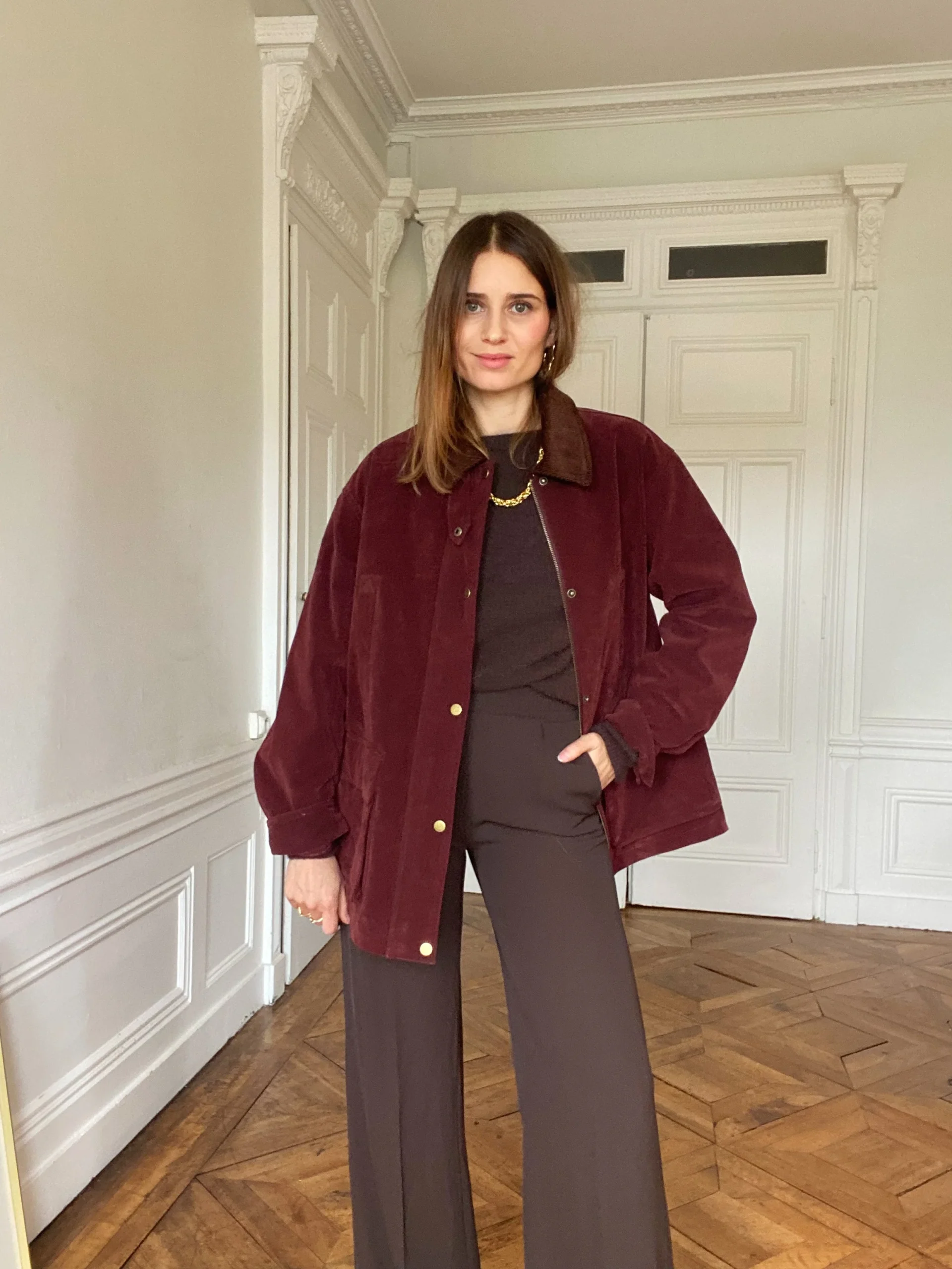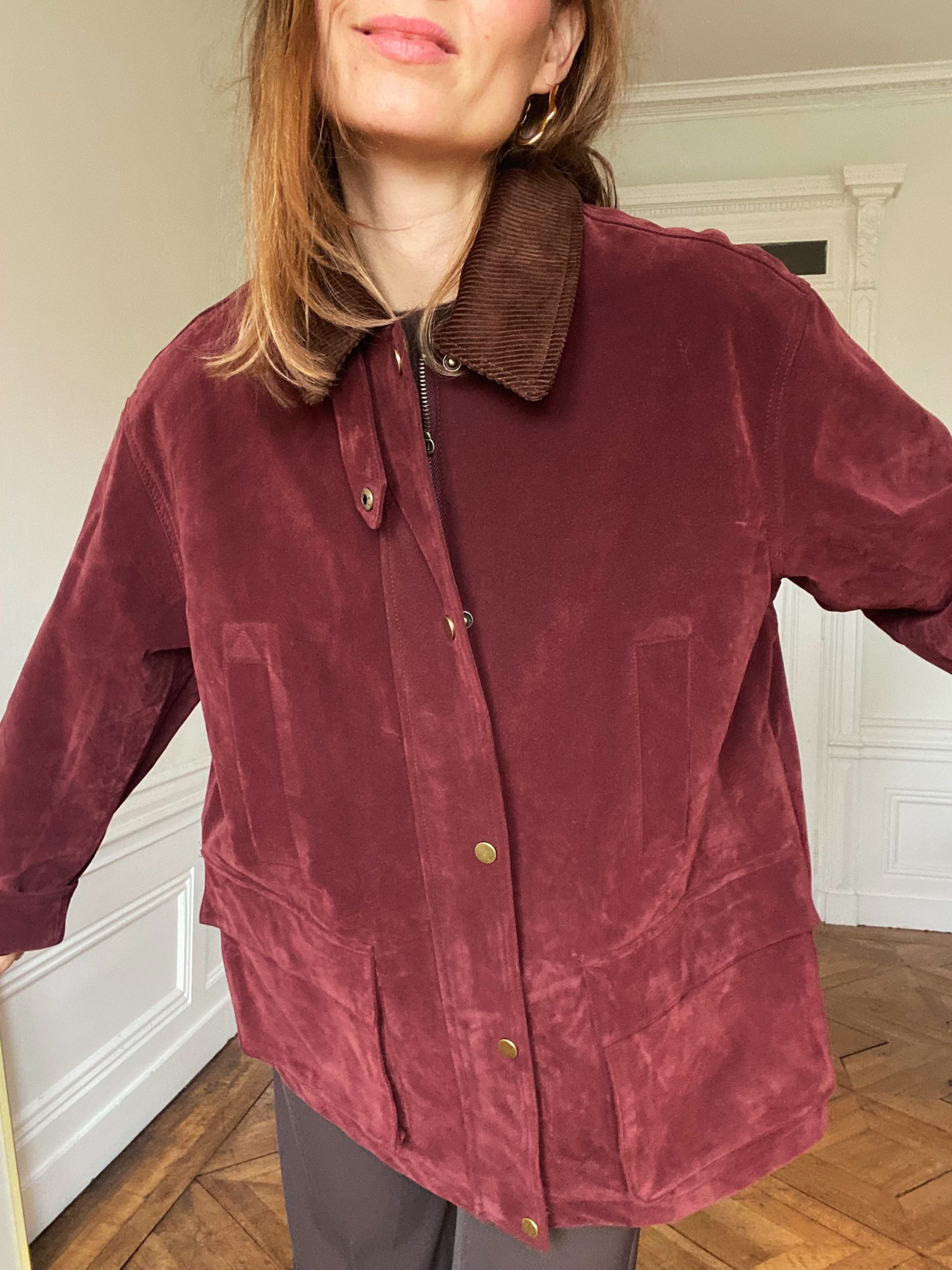 Coupe : Oversize, zip avant + boutons dorés, suédine bordeaux douce et élégante