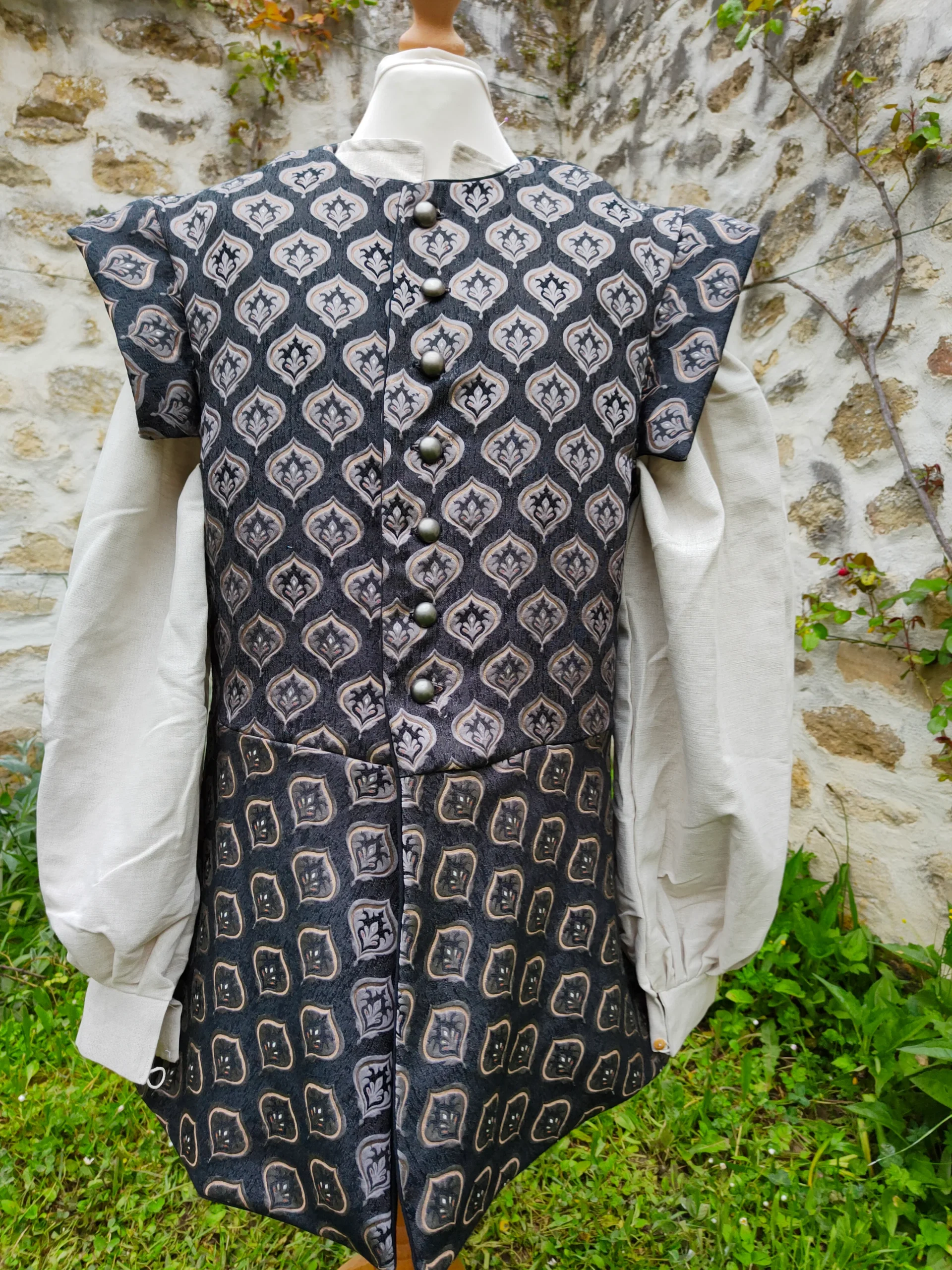 Découvrez la veste pourpoint à basques en jacquard noir pour homme. Avec sa doublure intégrale et son motif or et gris, cette veste est parfaite pour un costume historique, médiéval ou Renaissance. Ajoutez une touche d’authenticité à votre tenue avec cette pièce de qualité.