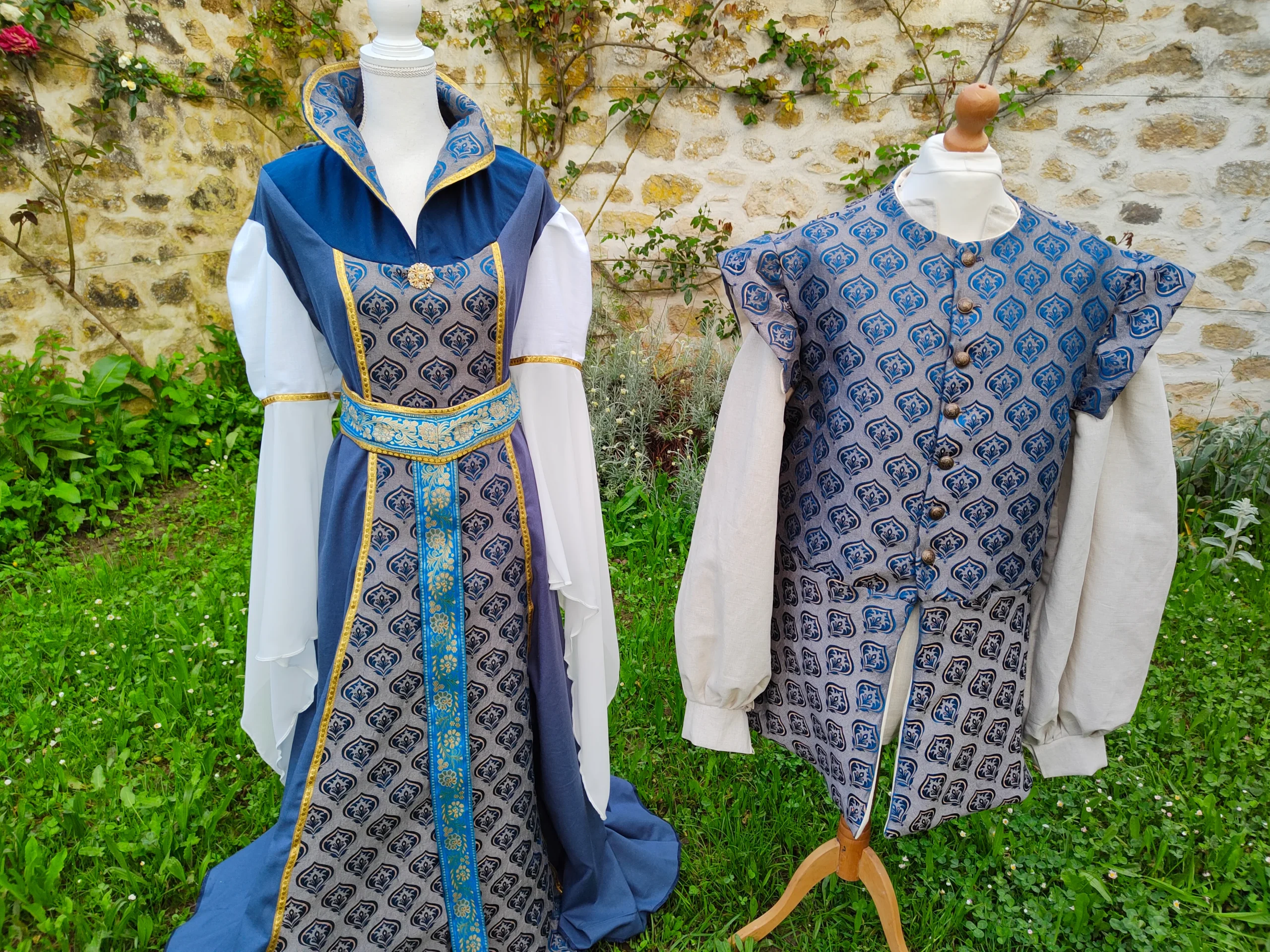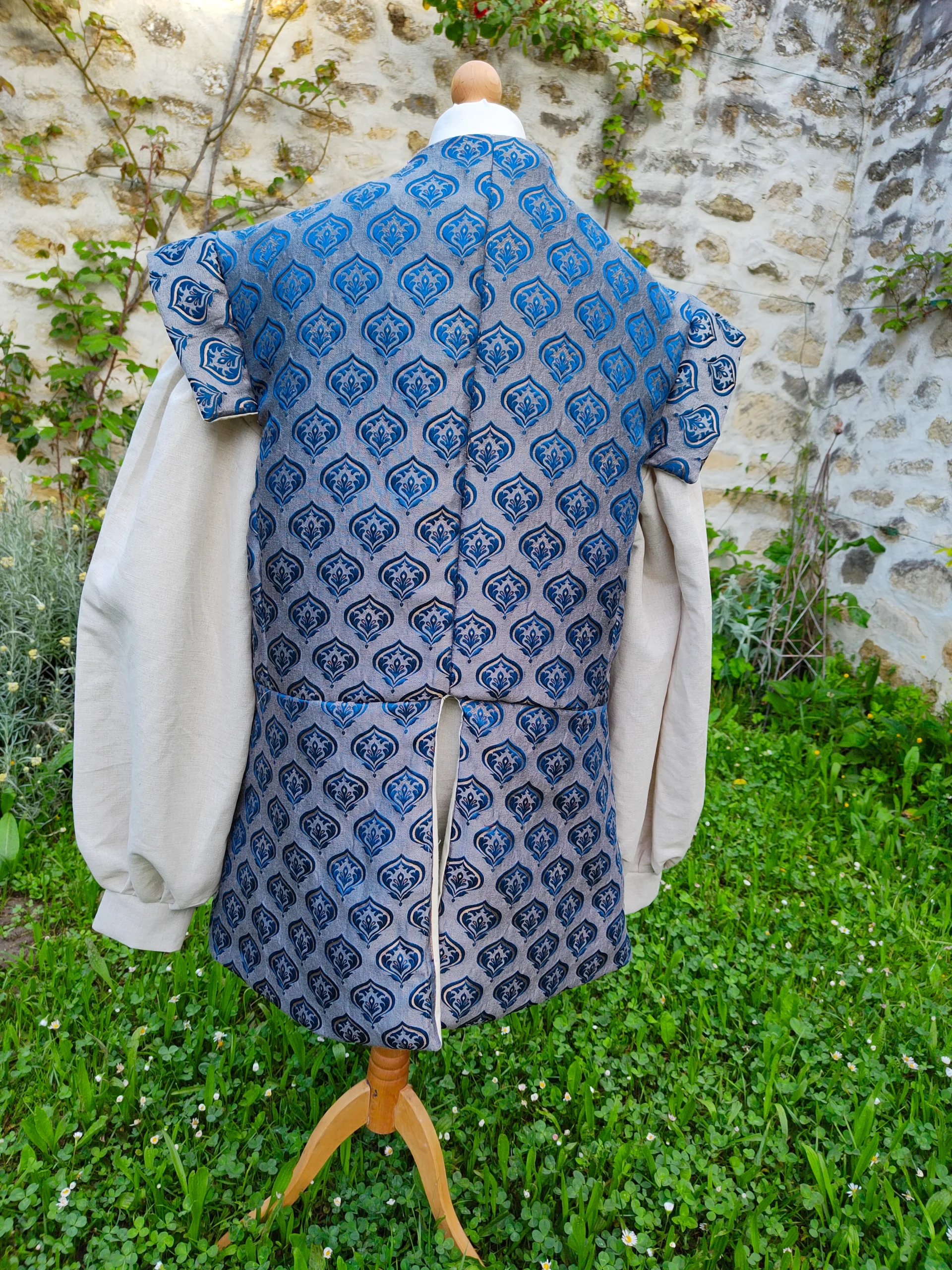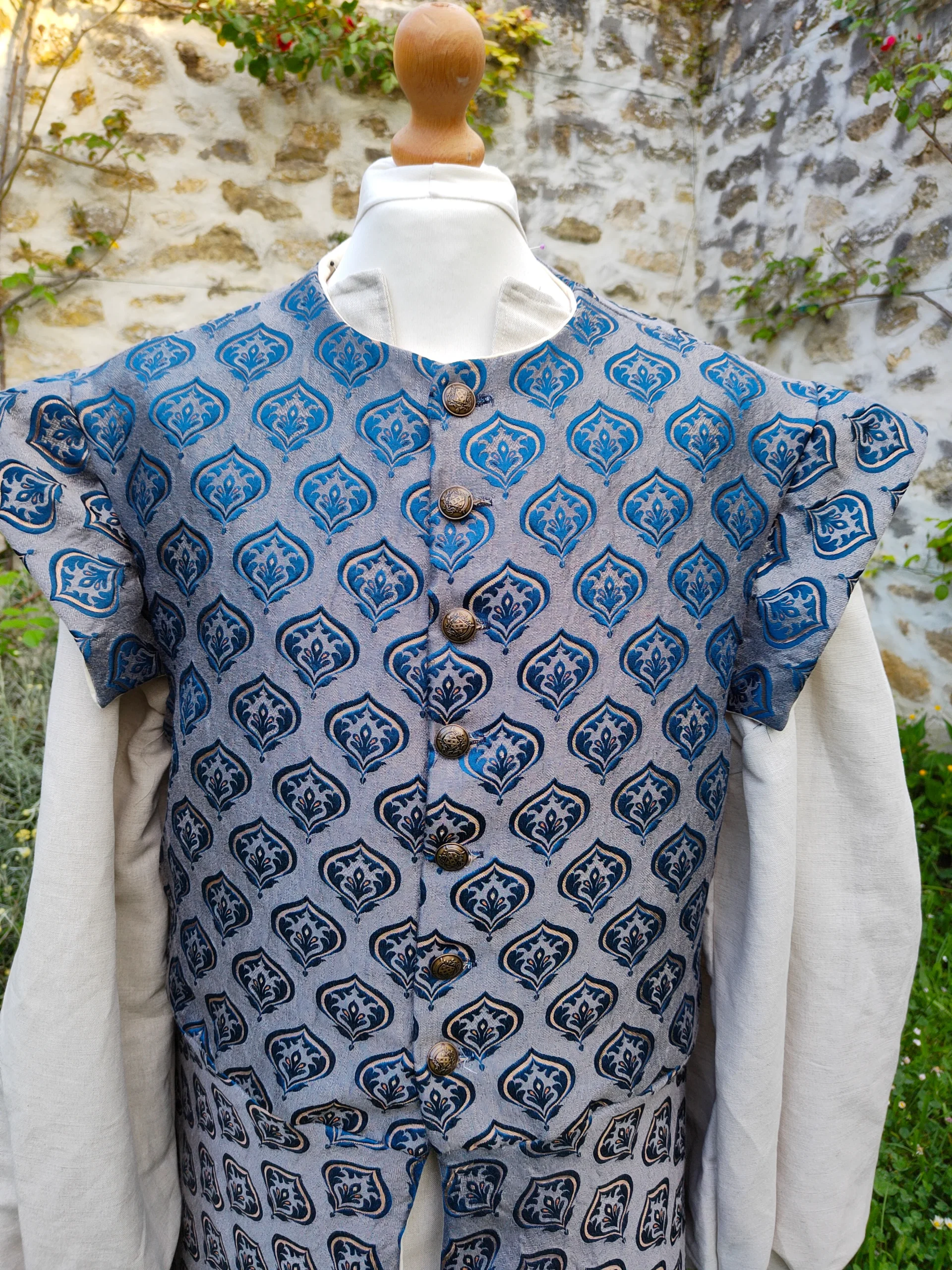 Cette veste pourpoint en jacquard bleu, doublée, est idéale pour un mariage ou pour se transformer en noble médiéval ou de la Renaissance.