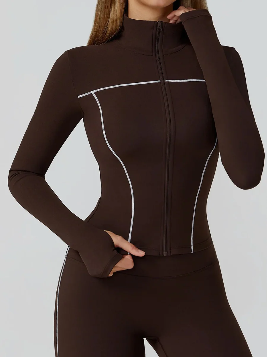 Conçue pour allier performance et féminité, cette veste de yoga épouse parfaitement les lignes du corps tout en assurant un confort absolu. Son tissu extensible et respirant accompagne chaque mouvement, tandis que les coutures contrastées affinent la silhouette avec subtilité. La fermeture zippée intégrale permet une aération personnalisée, idéale avant ou après vos séances de yoga, Pilates ou running. Les passants pour les pouces offrent une tenue impeccable et une touche sportive élégante. Un essentiel pour celles qui recherchent style, maintien et liberté.
